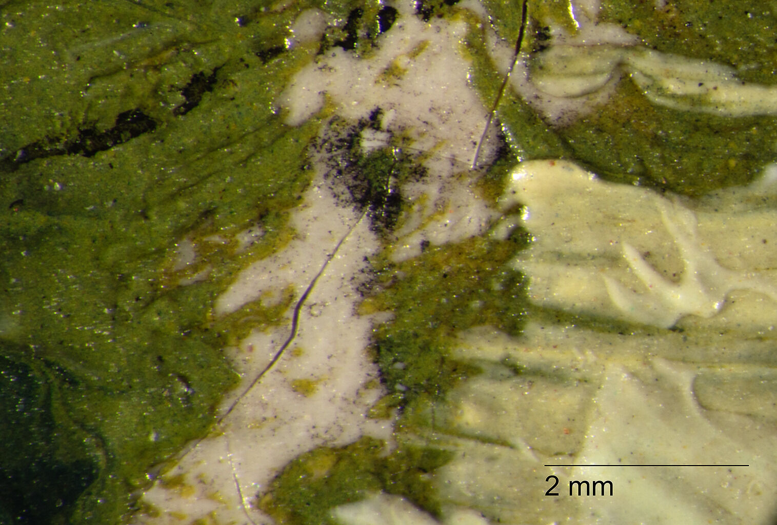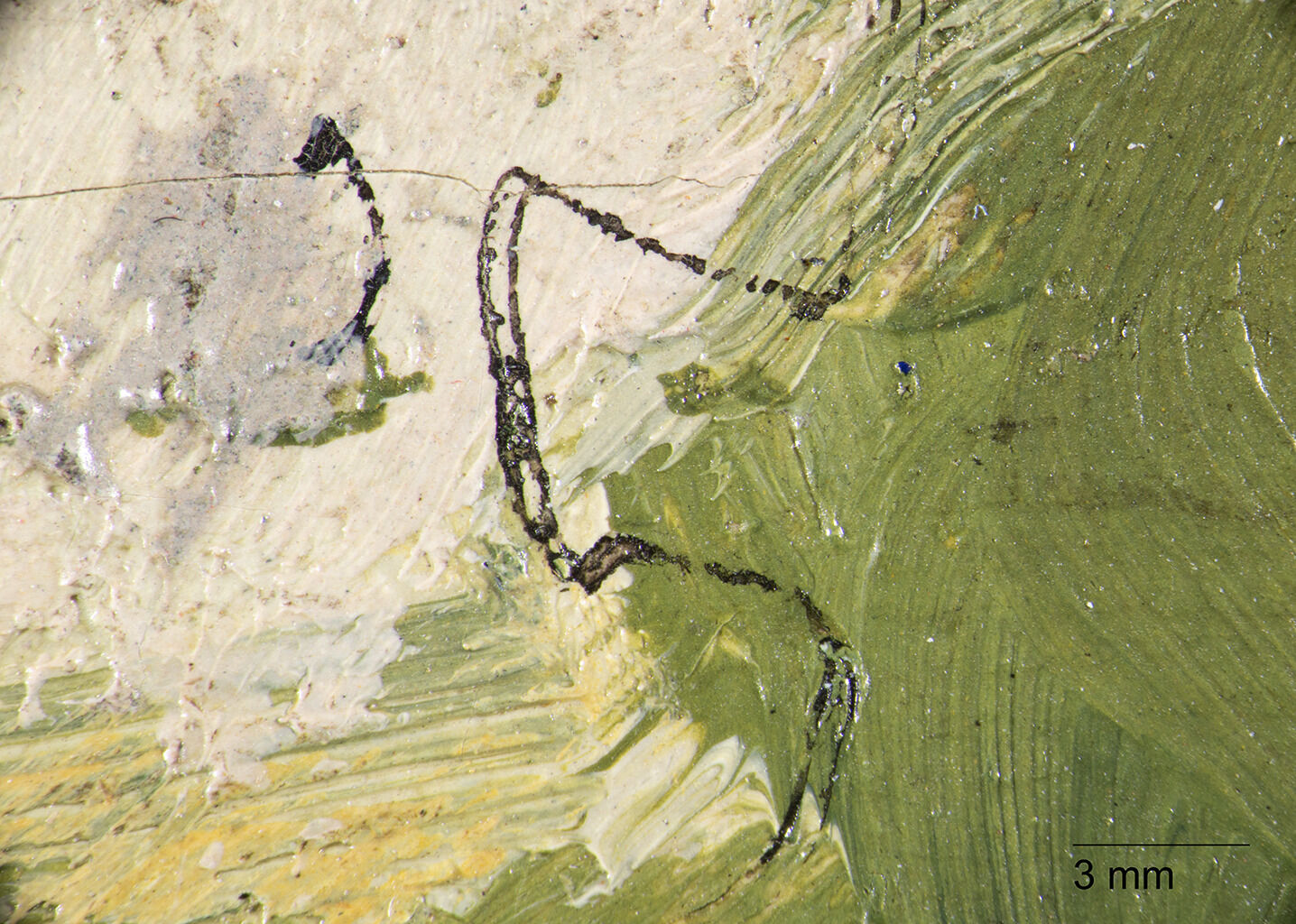 Fig. 7. Photomicrograph of sketch line visible between paint strokes of the leaves, Still Life with Guelder Roses (1892)