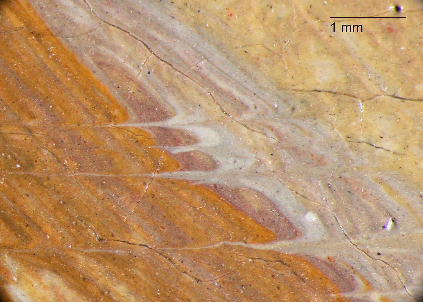 Fig. 9. Photomicrograph of wet-into-wet mixing of paint colors, Still Life with Guelder Roses (1892)