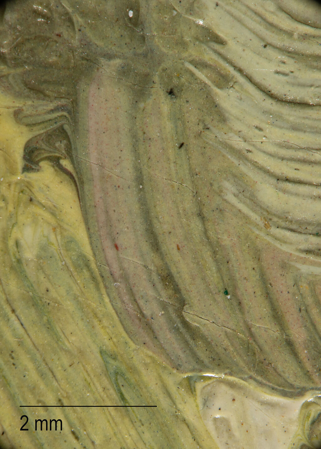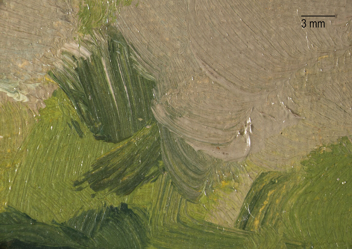 Fig. 8. Photomicrograph of the wet-over-wet brushwork between the leaves and background, Still Life with Guelder Roses (1892)