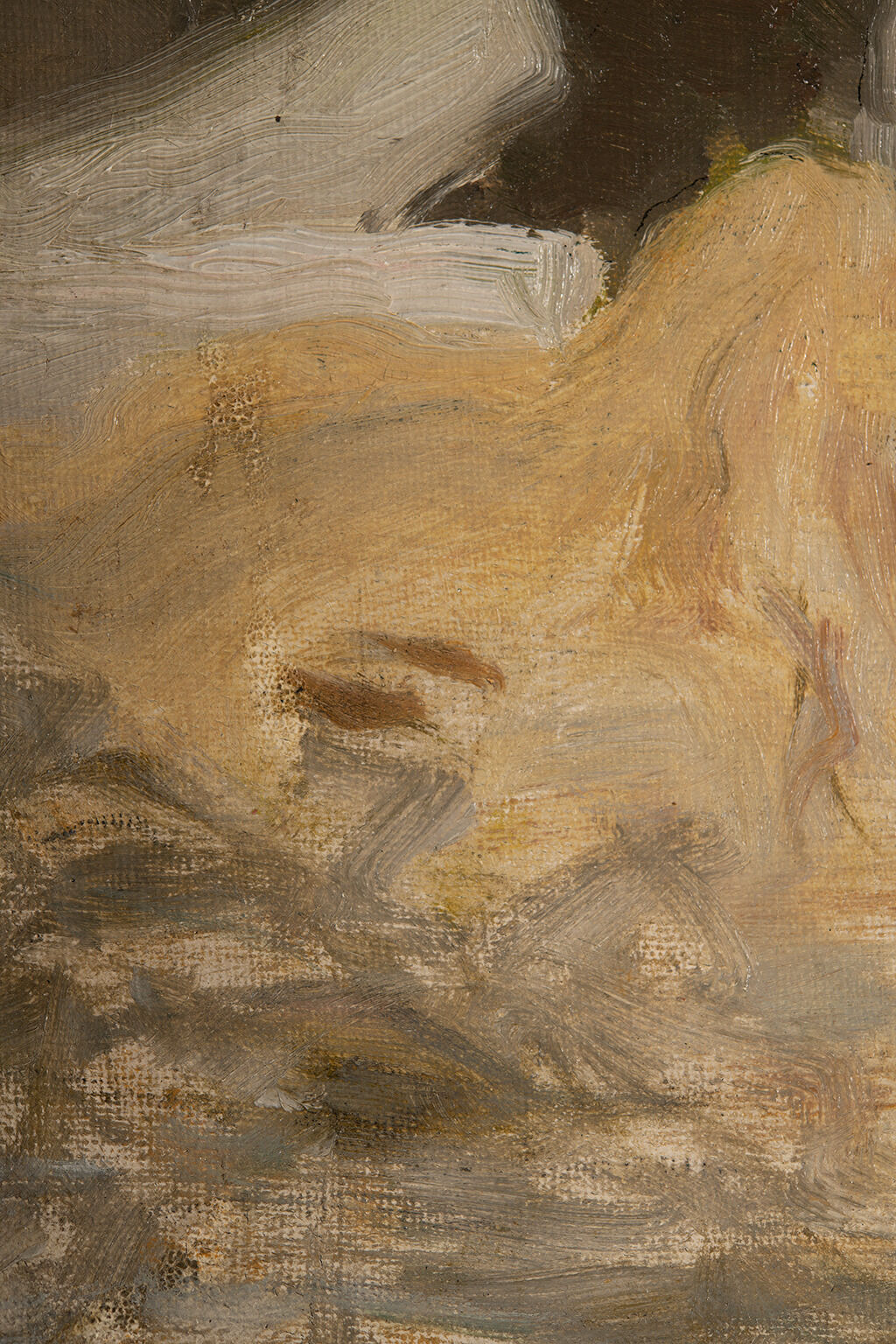 On the lower right, Bonnard signed and dated the painting—“Bonnard 1892”—with light gray paint. Given that the wet-over-dry brushwork caused no disruption to the underlying textures of the background paint (Fig. 17), it is possible that this inscription was added in 1929. Furthermore, traces of dark material raise the possibility of an earlier signature in this same location. Figure 18 reveals the faint “189” as well as an arcing shape that echoes the upward curve of Bonnard’s “d.” This potential modification to the signature does not seem unusual for the artist. A 2020 technical study of Nude revealed a faint date on the top edge, and based on archival photographs and ultravioletultraviolet (UV) radiation: A segment of the electromagnetic spectrum, just beyond the sensitivity of the human eye, with wavelengths ranging from 100–400 nanometers. For a description of its use in the study of art objects, see ultraviolet (UV) fluorescence or UV-induced visible fluorescence. examination, Bonnard appears to have made some minor adjustments to the Gothenberg painting sometime after 1923, which included covering the date with paint.10Skalleberg, “Nude (Aprés le Bain),” 41–42, 59, figs. 31–32.