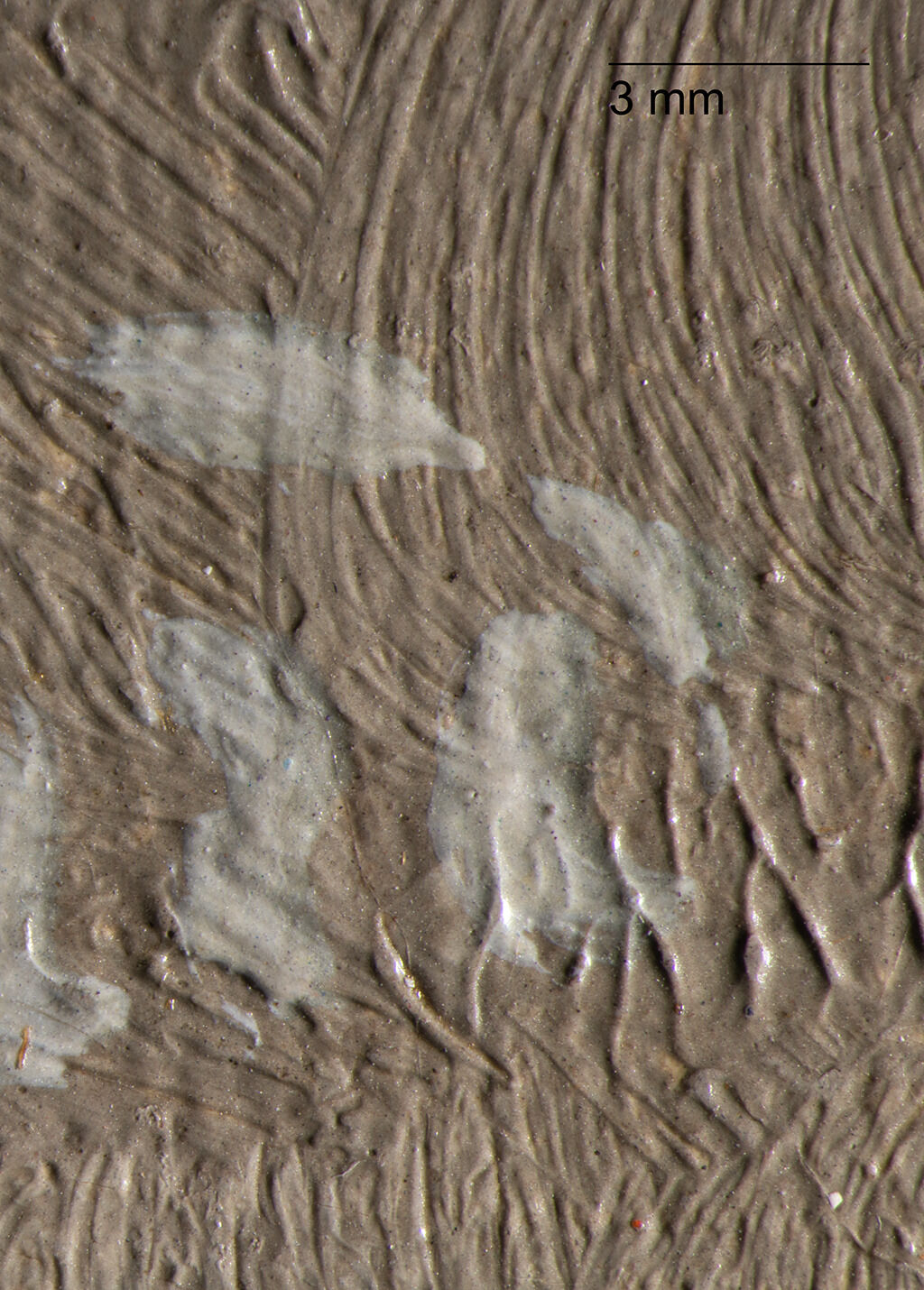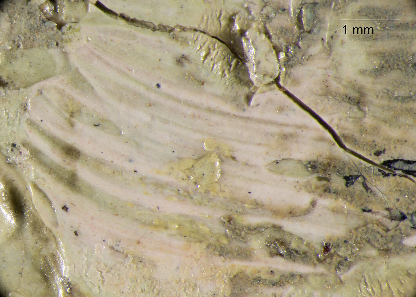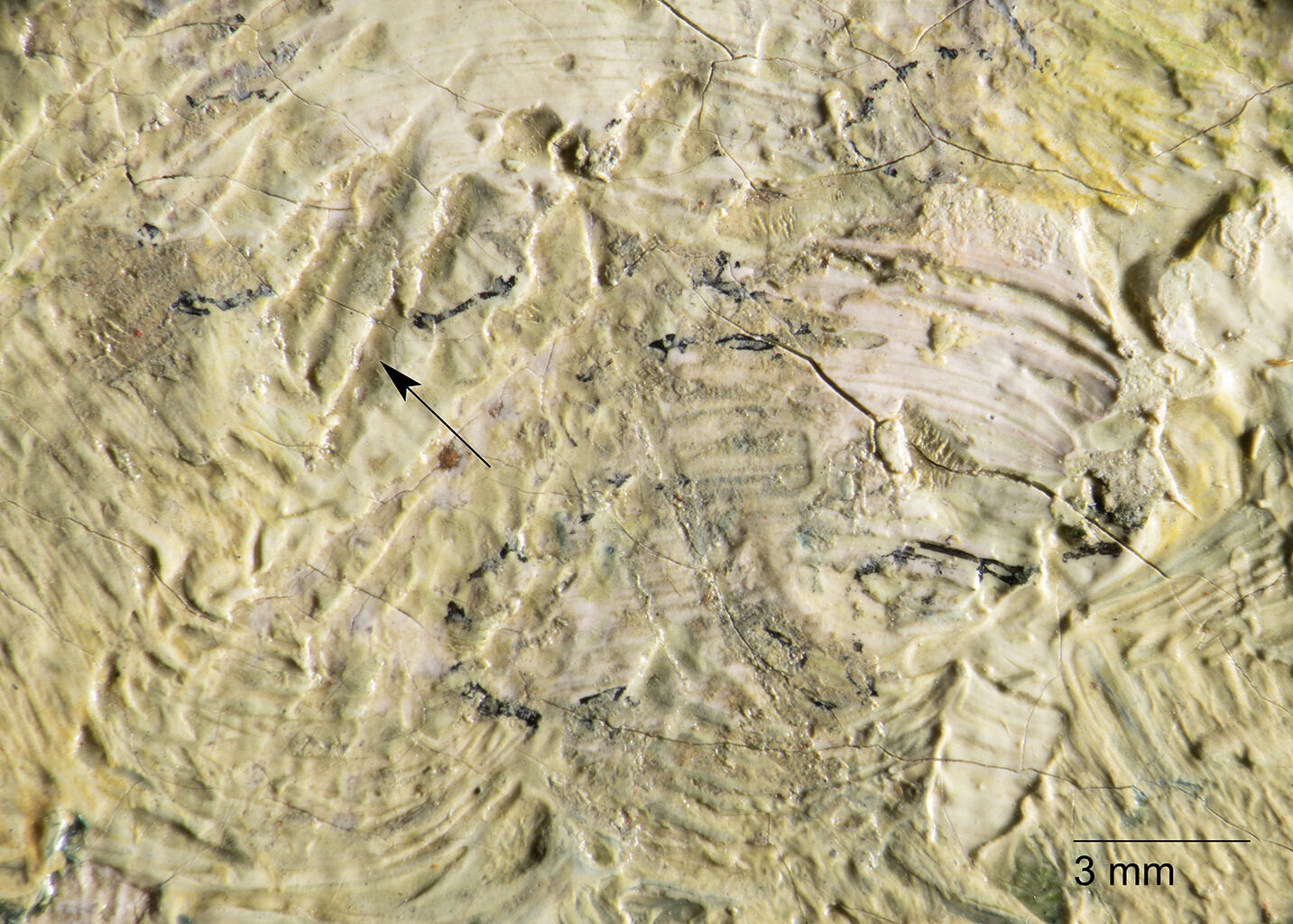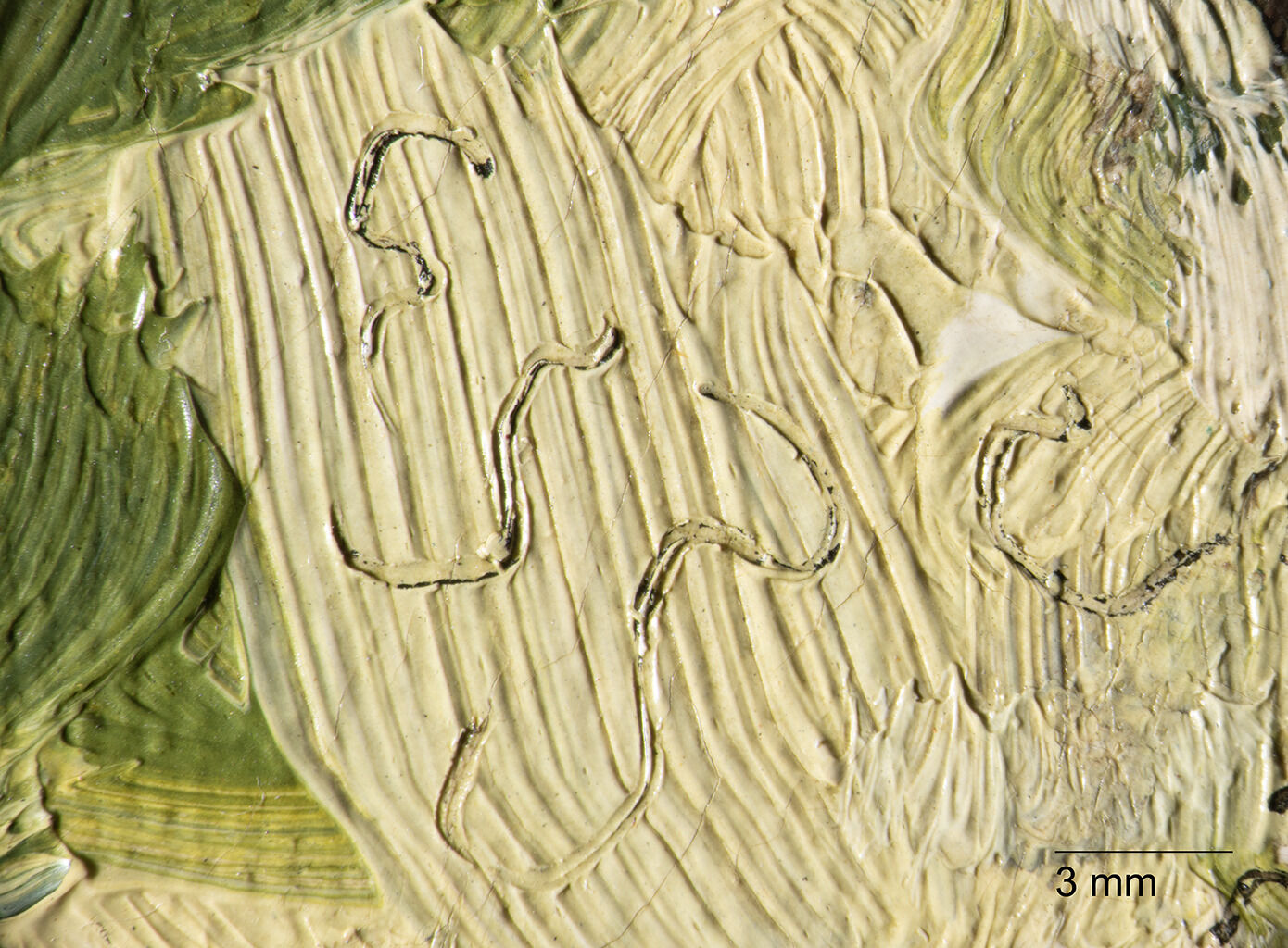 Fig. 13. Photomicrograph with raking illumination, Still Life with Guelder Roses (1892), showing incised marks made into the wet paint of the flowers