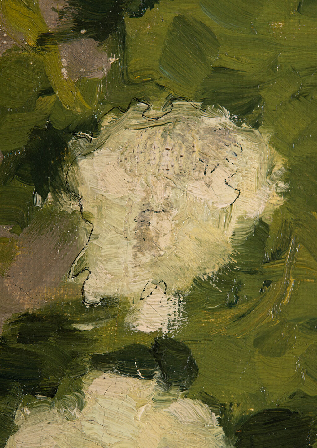 Bonnard described himself as painting “with a brush in one hand, a rag in the other,” notes scholar Bernard Dunstan. “He would take out paint by wiping and rubbing as well as with a knife, as this could give him a more suggestive, clouded surface to paint into.”5Bernard Dunstan, Painting Methods of the Impressionists, (New York: Watson-Guptill, 1983), 144–45. Indeed there are areas on the Nelson-Atkins painting where he scraped and incised into the partially dry paint of the blooms with a sharp tool (Fig. 14). Similar scraping of the paint surface has been documented on Bonnard’s Nude (1903; Gothenberg Museum of Art, WL84).6Victoria Skalleberg, “Nude (Aprés le Bain): An Inter-Disciplinary Technical Study of an Oil Painting on Cardboard by Pierre Bonnard” (master’s thesis, Department of Conservation, University of Gothenburg, 2020), 37, fig. 19.