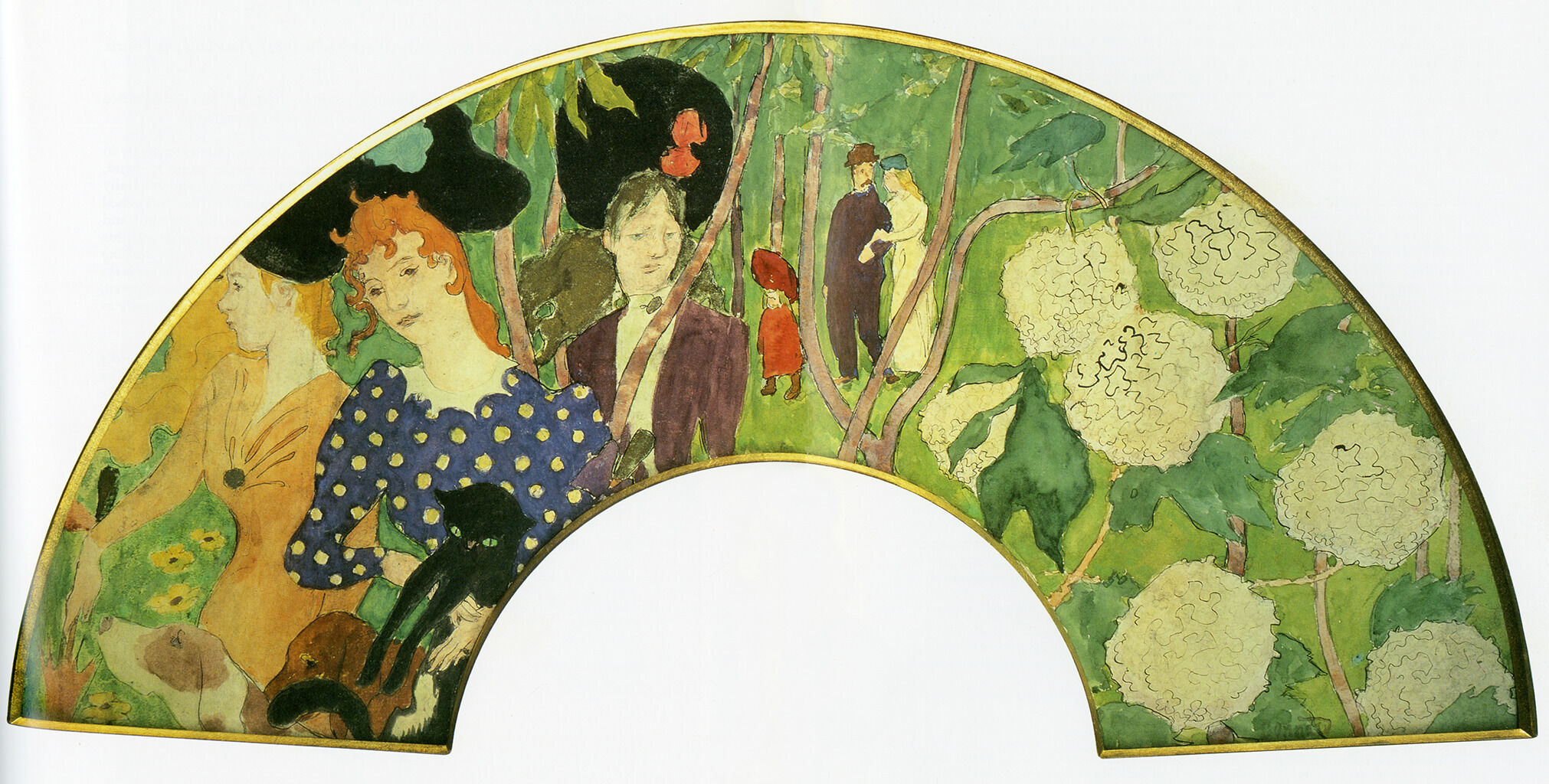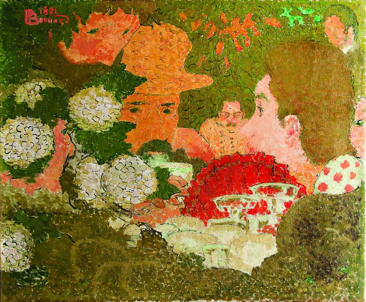 Guelder roses are also present in Bonnard’s Design for a Fan: Women and Flowers (Fig. 3). On the right half, the white blossoms and green leaves appear against another solid backdrop in a lighter tone of green. On the left side, three fashionable women—along with two dogs and a cat—present the artist with an opportunity to play with the patterns and shapes of their clothing, hats, and hair. At the center, the smaller figures of a couple and a child provide the only suggestion of spatial recession. This watercolor is one of a handful of designs for fans that Bonnard produced in the early 1890s.12Along with his fellow Nabis, Bonnard sought to merge art and life with forays into the decorative arts, creating fans, screens, stained glass, and more. Stephen Ongpin, An Exhibition of Master Drawings. . . ., exh. cat. (New York: Colnaghi, 1998), 59. For more on the decorative projects of Bonnard and the other Nabis, see Gloria Groom, ed., Beyond the Easel: Decorative Painting by Bonnard, Vuillard, Denis, and Roussel, 1890–1930, exh. cat. (Chicago: Art Institute of Chicago, 2001). Similar white flowers appear in a multifigural composition from the same year, Afternoon in the Garden (Fig. 4). This canvas demonstrates the progression of Bonnard’s decorative aesthetic, which prioritized color and pattern over naturalistic representation and even legibility. The faces of his sister, nephew, and other family members are obscured by foliage, a red fan, and nebulous shapes along the bottom register.13Katherine M. Kuenzli, “Theorizing the Nabis: Julius Meier-Graefe and the Making of a Modern Aesthetic,” in Bonnard to Vuillard: The Intimate Poetry of Everyday Life, The Nabi Collection of Vicki and Roger Sant, ed. Elsa Smithgall, exh. cat. (Washington, DC: Phillips Collection, 2019), 31. The artist’s exaggerated approach to color and line merged foreground and background to create an overall sense of rhythm. Bonnard exhibited Afternoon in the Garden at his first showing at the Salon des Indépendants (March 20–April 27, 1891), to which he submitted five paintings and four decorative panels.14The other exhibited paintings were Andrée Bonnard with Her Dogs (1889; private collection), On the Parade Ground (1890; private collection), The Good Dog (1891; private collection), and Study of a Cat (1891; private collection). Although he originally envisioned the four panels of Women in the Garden (1891; Musée d’Orsay, Paris) as a screen, Bonnard separated them, framed them individually, and hung them on the wall as a group. See Terrasse, Bonnard: Shimmering Color, 20. Bonnard’s avant-garde works challenged the public, and one critic characterized them as “risky ventures” that “defy all criticism.”15“Les envois de M. Bonnard et de M. Wilhumsen, semblent des gageures et défient toute critique” (The submissions of M. Bonnard and of M. Wilhumsen seem to be risky ventures and defy all criticism). Jules Antoine, “Critique d’art: Pavillon de la Ville de Paris. Exposition des Artistes Indépendants,” La Plume 3, no. 49 (May 1, 1891): 157. At this time, the artist was deliberately seeking to develop new directions in his art. By September of the following year, he wrote to Vuillard that he was finally making progress: “Painting, particularly in oil, has kept me very busy; it is going slowly, very timidly, but I believe I am on the right track.”16“La peinture à l’huile entre autres m’a beaucoup occupé; cela va bien doucement, bien timidement mais je crois être sur la bonne voie.” Pierre Bonnard, Le Grand-Lemps, to Edouard Vuillard, September 19, 1892, in Antoine Terrasse, ed., Bonnard/Vuillard correspondance (Paris: Gallimard, 2001), 23.