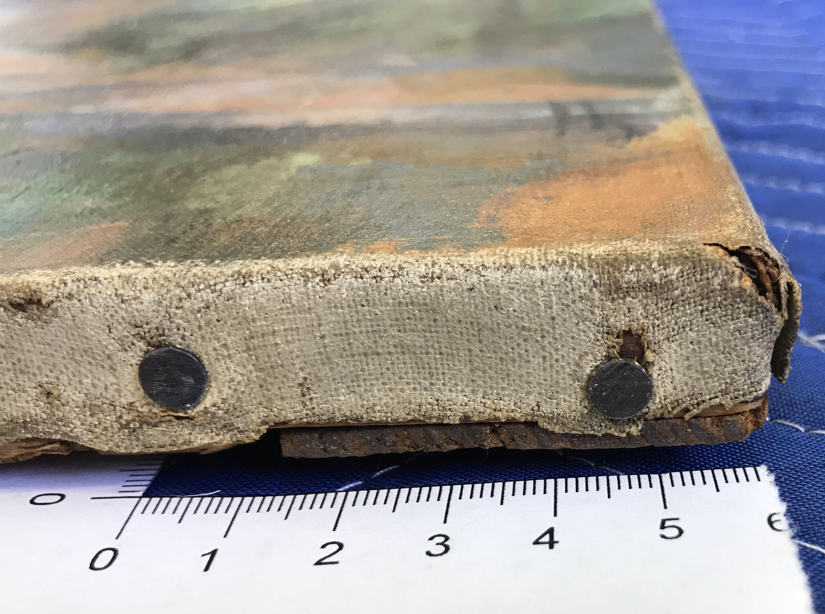 Quarry at Bibémus is mounted on a commercially made five-member, wooden stretcherstretcher: A wooden structure to which the painting’s canvas is attached. Unlike strainers, stretchers can be expanded slightly at the joints to improve canvas tension and avoid sagging due to humidity changes or aging. possibly original to the painting. The corner joints are open mortise and tenon, while the crossbar joints appear to be blind mortise and tenon. During a conservation treatment of the painting in 2019, the canvas was temporarily removed from the stretcher. At this time, it was discovered that only one set of tack holes are present on the top, left, and right edges of the stretcher, indicating that this stretcher had not been re-used. The bottom edge, however, has two sets of holes, one set corresponding to those on the canvas, and one set that cannot be explained.1Diana M. Jaskierny, May 1, 2020, treatment report, NAMA conservation file, no. 2015.13.7.