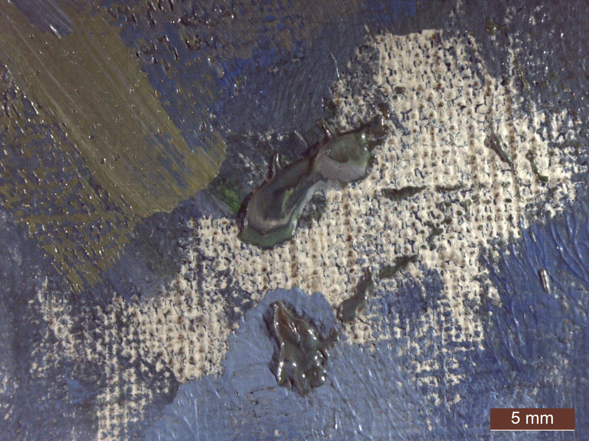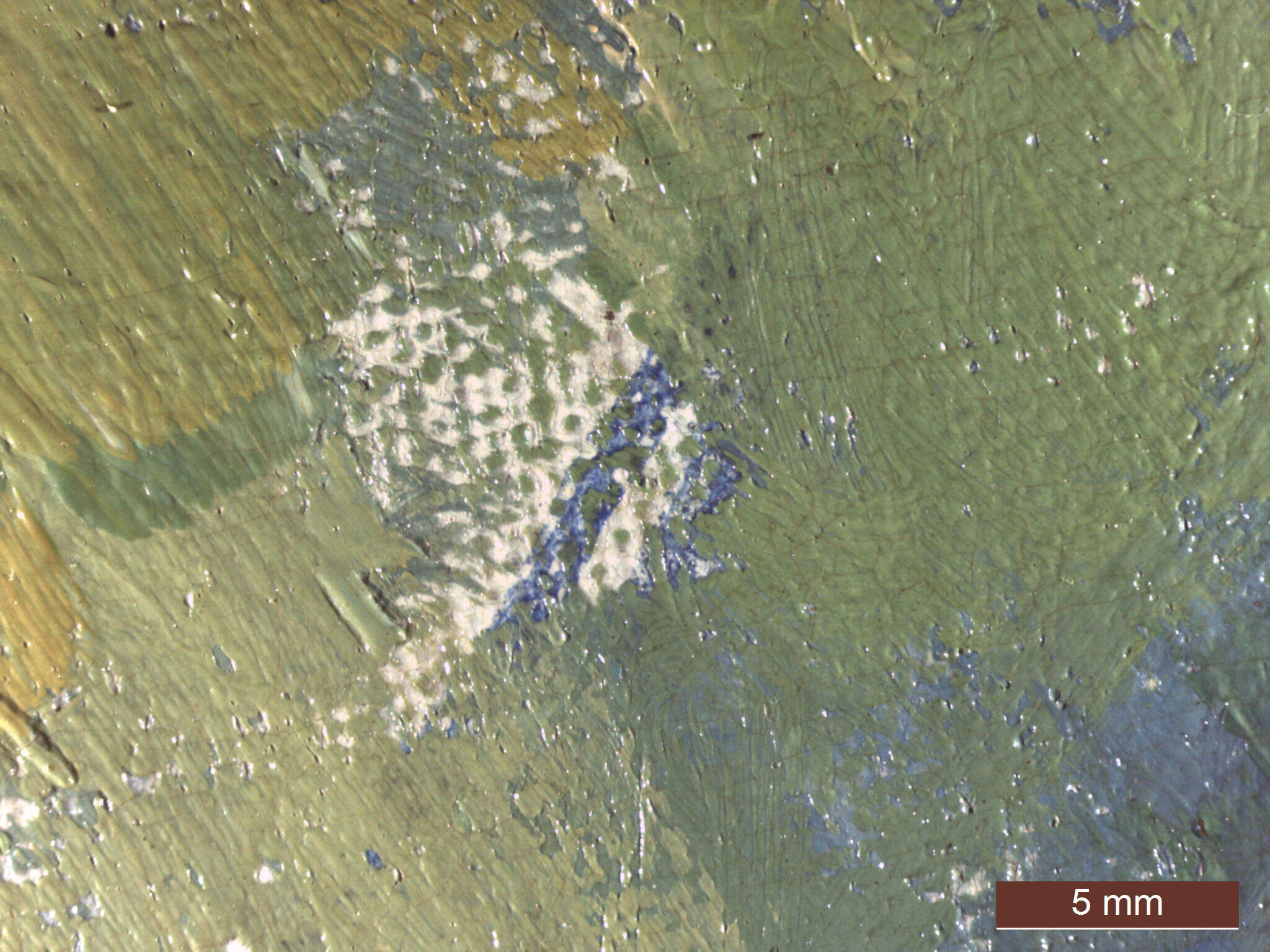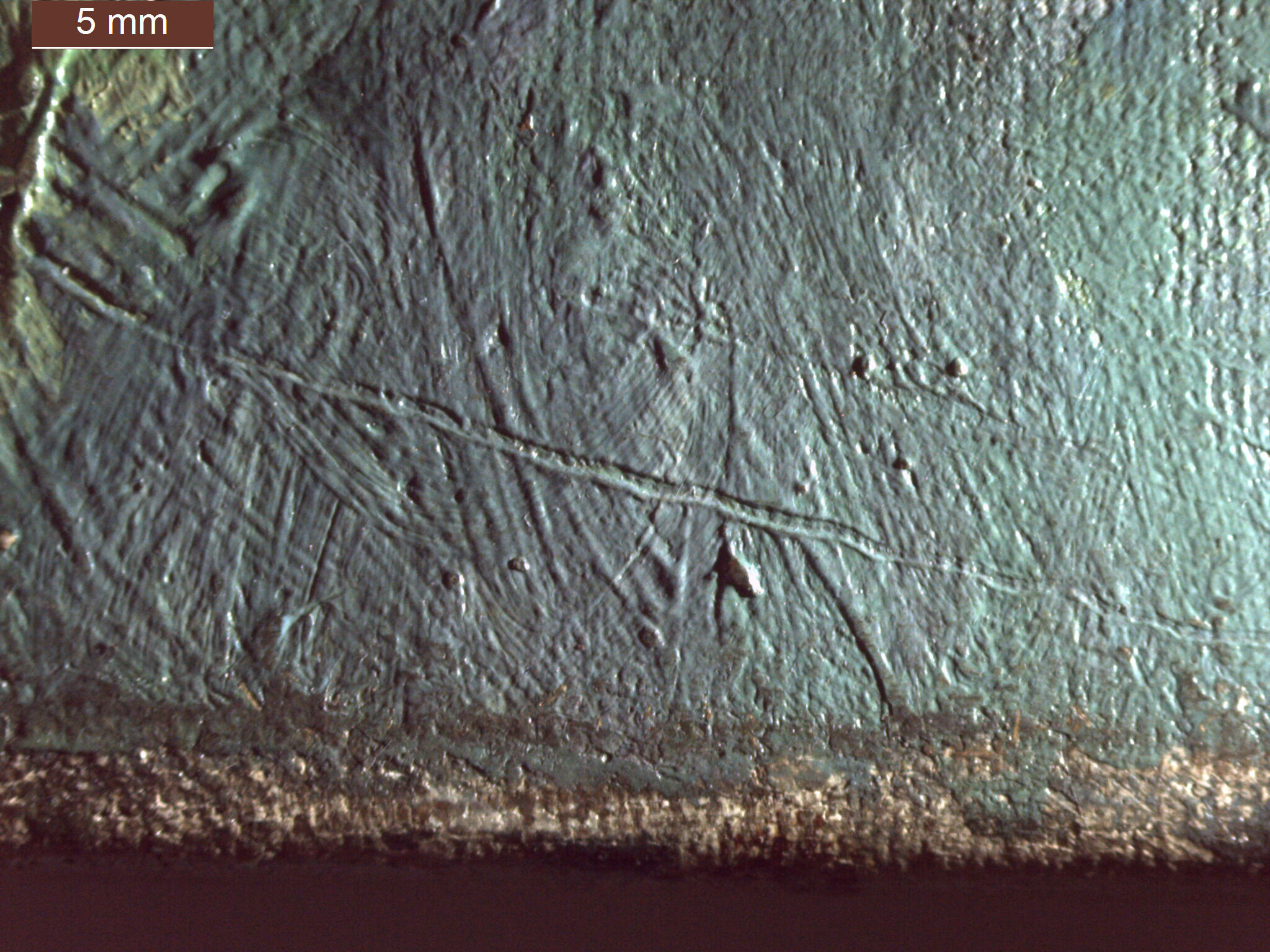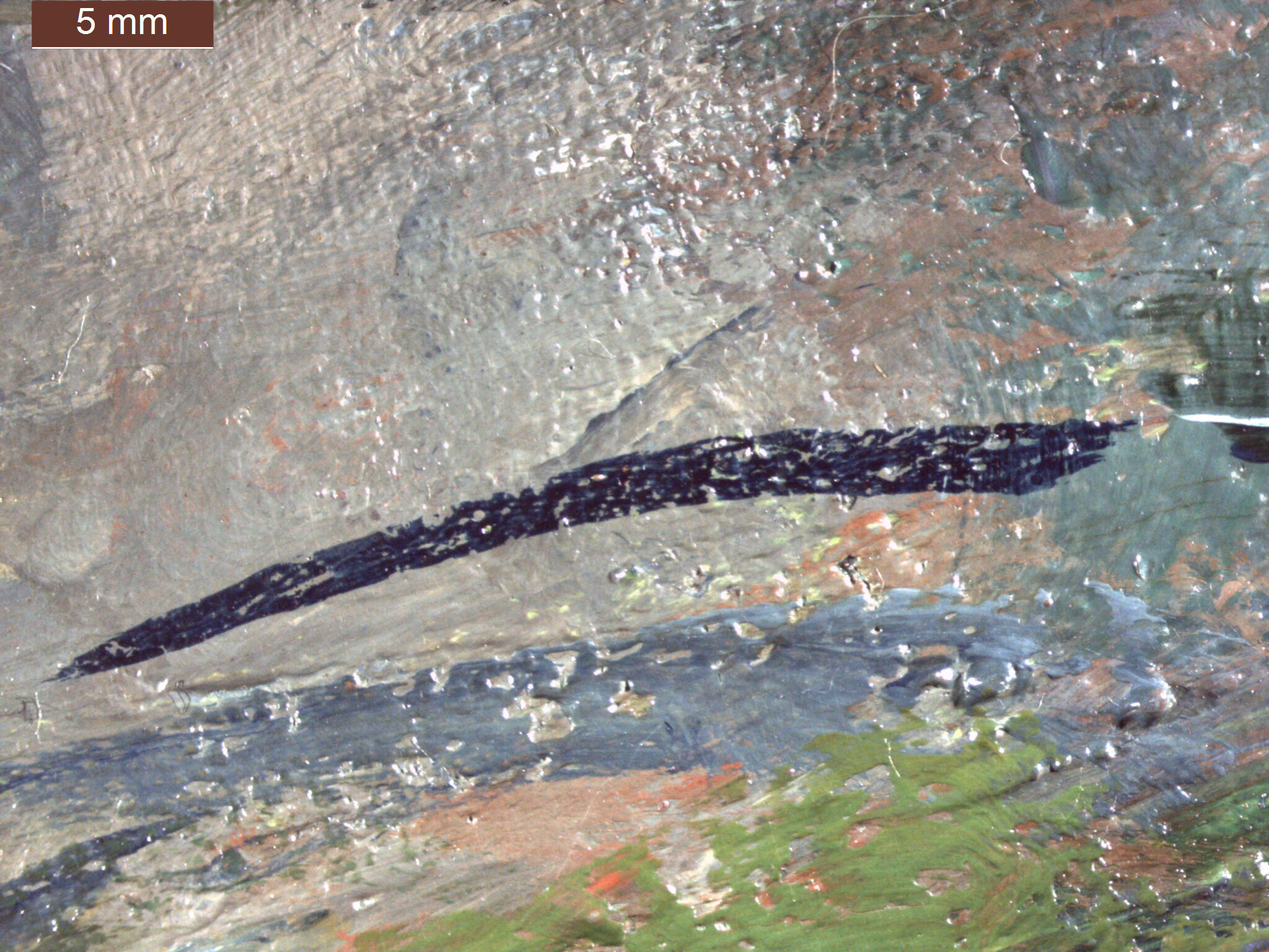 In addition to the thin blue strokes in the lower applications, at various points in completing the composition, similar though slightly more opaque strokes are found throughout the painting. They can be found between paint passages (Fig. 10) and as final accents on top of the paint layer (Fig. 11). Several incised lines are evident in the painting; however, these do not appear to relate directly to the composition and are most likely the result of a brush handle or tool dragging across still-wet paint (Fig. 12).