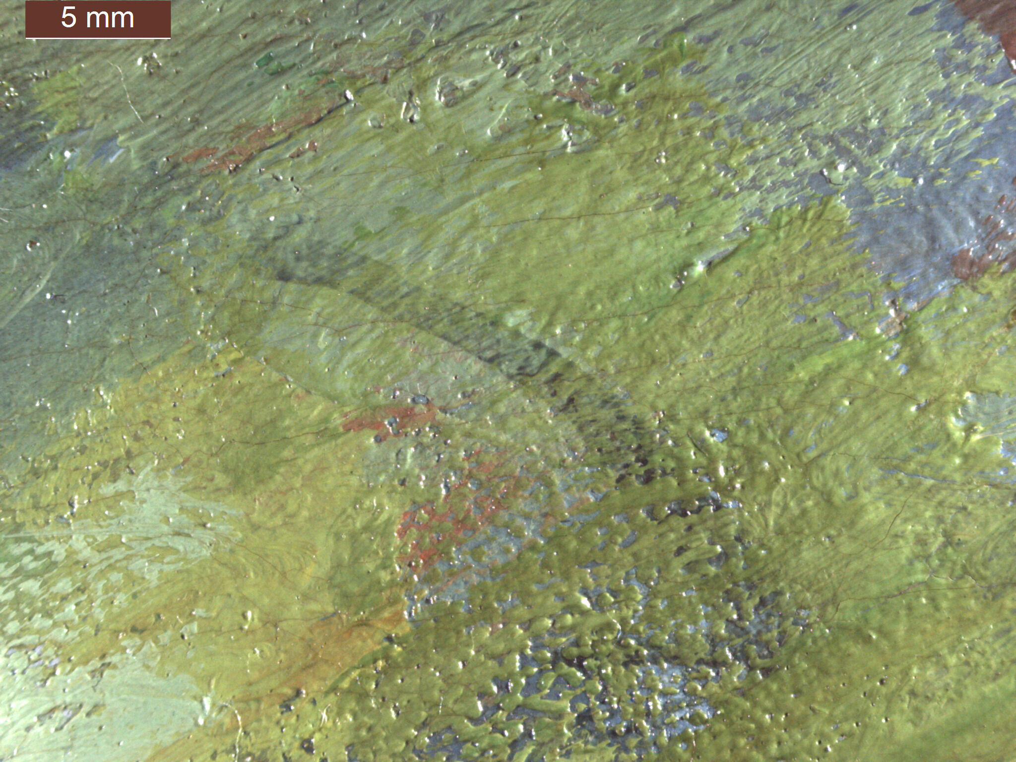 The paint layer was applied with varying levels of thickness, ranging from thin washes to more heavily bodied paint, however there is relatively little impastoimpasto: A thick application of paint, often creating texture such as peaks and ridges.. The areas of more heavily bodied paint exhibit a higher sheen compared to the thinly applied passages. Most paint applications appear to have been completed with brushes ranging in size from 1/4 inch to 1/2 inch.