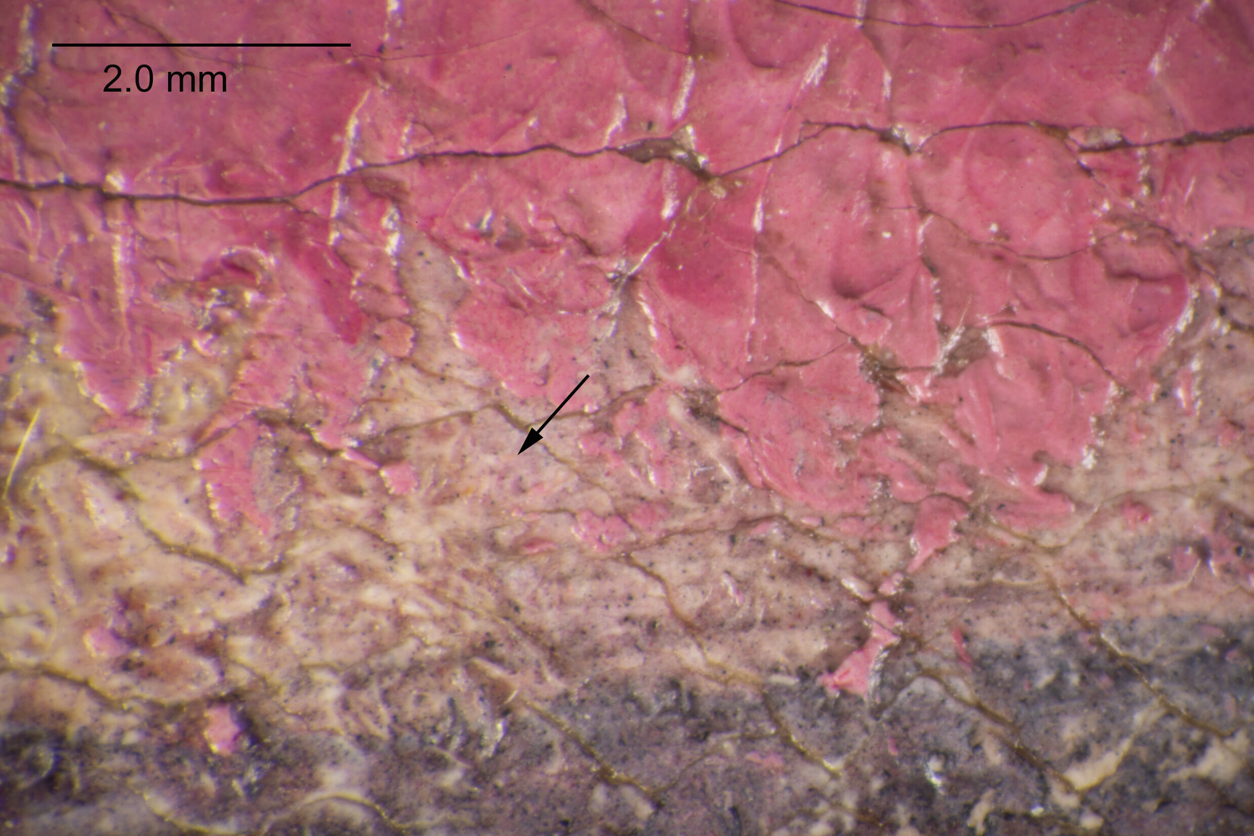 Fig. 9. Photomicrograph of the pale pink underpainting beneath the dress, Faaturuma (Melancholic) (1891)