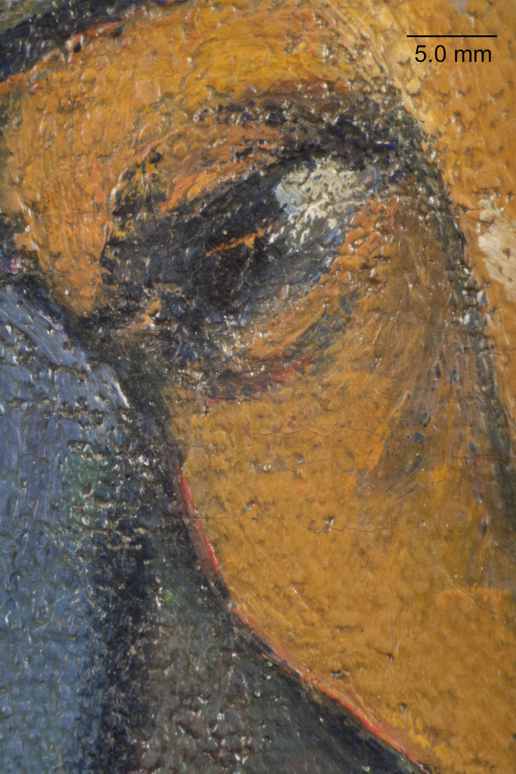 paint. Gauguin thus created reflected light in the shadow and a subtle color vibration around the eye.”8VJirat-Wasiutyński and Newton, Technique and Meaning in the Paintings of Paul Gauguin, 112. He produced a similar vibration on the Nelson-Atkins painting when he disrupted the blue outline along the