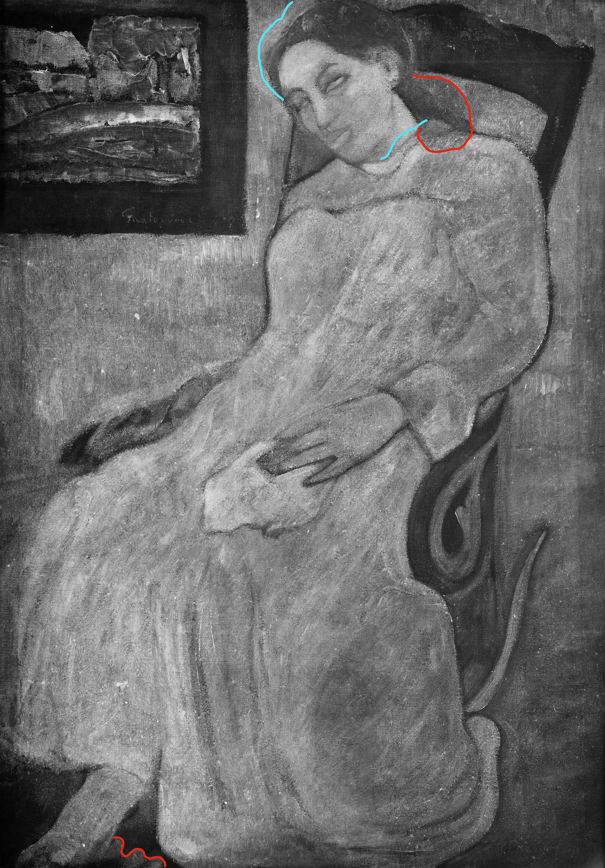 Fig. 14. Radiograph of Faaturuma (Melancholic) (1891) with red annotations indicating shapes no longer visible on the paint surface and blue annotations indicating the position of elements in the final composition