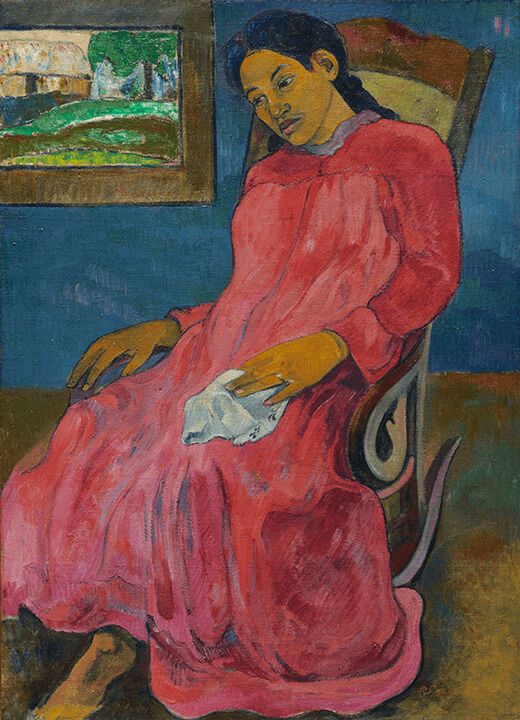 In this intensely colored figure study, a young woman sits in a French colonial rocking chair in a shallow interior space defined by an earthen-colored floor and a rich marine blue wall. The copious dress draws attention to the arresting hot salmon color that pulsates on the surface of the canvas. In the course of painting the dress, Gauguin lengthened the skirt’s hemline by several inches, thus accentuating a single bare foot that is elongated beyond natural proportion. A distracting note is introduced by the bright yellow brushwork broadly painted across her brown toes, which announces a purely painterly touch. Other bold touches include two parallel pink strokes that hover improbably on the blue wall at the upper right. By such means, Gauguin asserts that his picture is a poetic and decorative arrangement of form on canvas, an embodiment of visual ideas as much as it is a composed portrait or a memory of his observations.