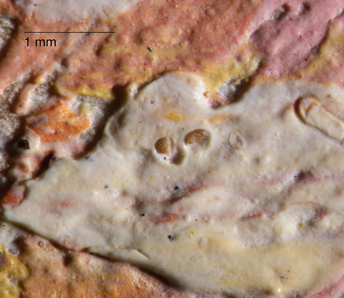 In comparison, the figure or figures slightly closer to the center were added to the landscape at a later stage in the painting process, after the walkway was completed. The paint of the walkway extends beneath these added elements.