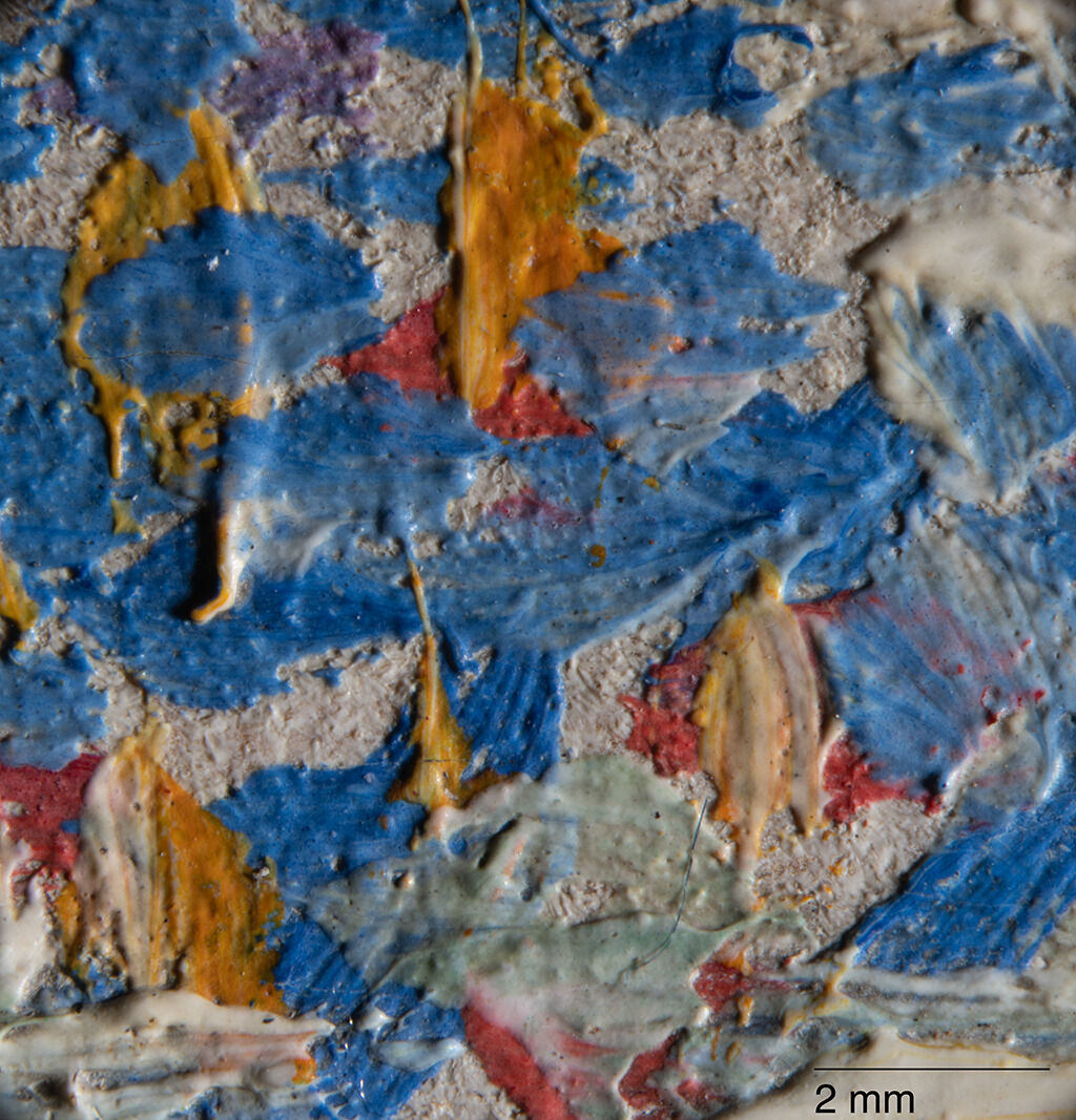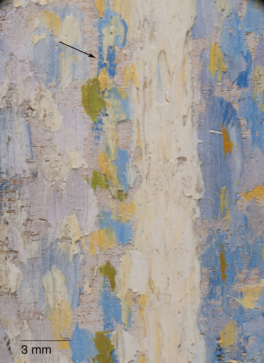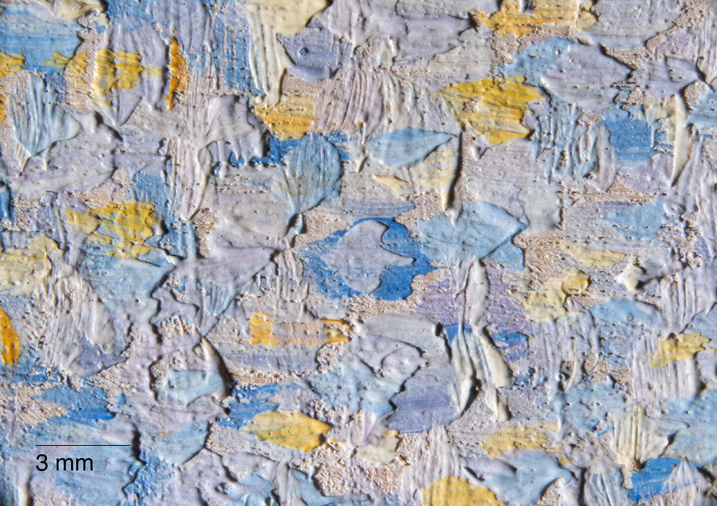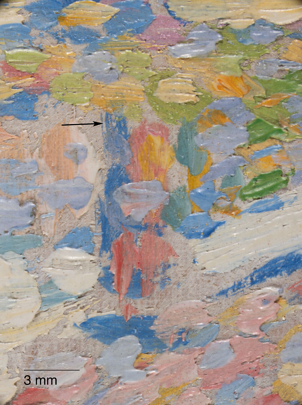 Throughout the composition, the paint strokes are often directional, emphasizing the scene’s receding perspective to the right. In the foreground and middle ground, short, diagonal brushwork moves toward the top right corner, leading the viewer’s eye parallel to the direction of the walkway. In comparison, in the left and central portions of the sky, the brushwork alternates between horizontal and vertical short strokes (Fig. 10), while the marks in the right section of the sky are predominantly horizontal. The most haphazard brushwork is found in the water near the boat, imitating the rippling near the hull.
