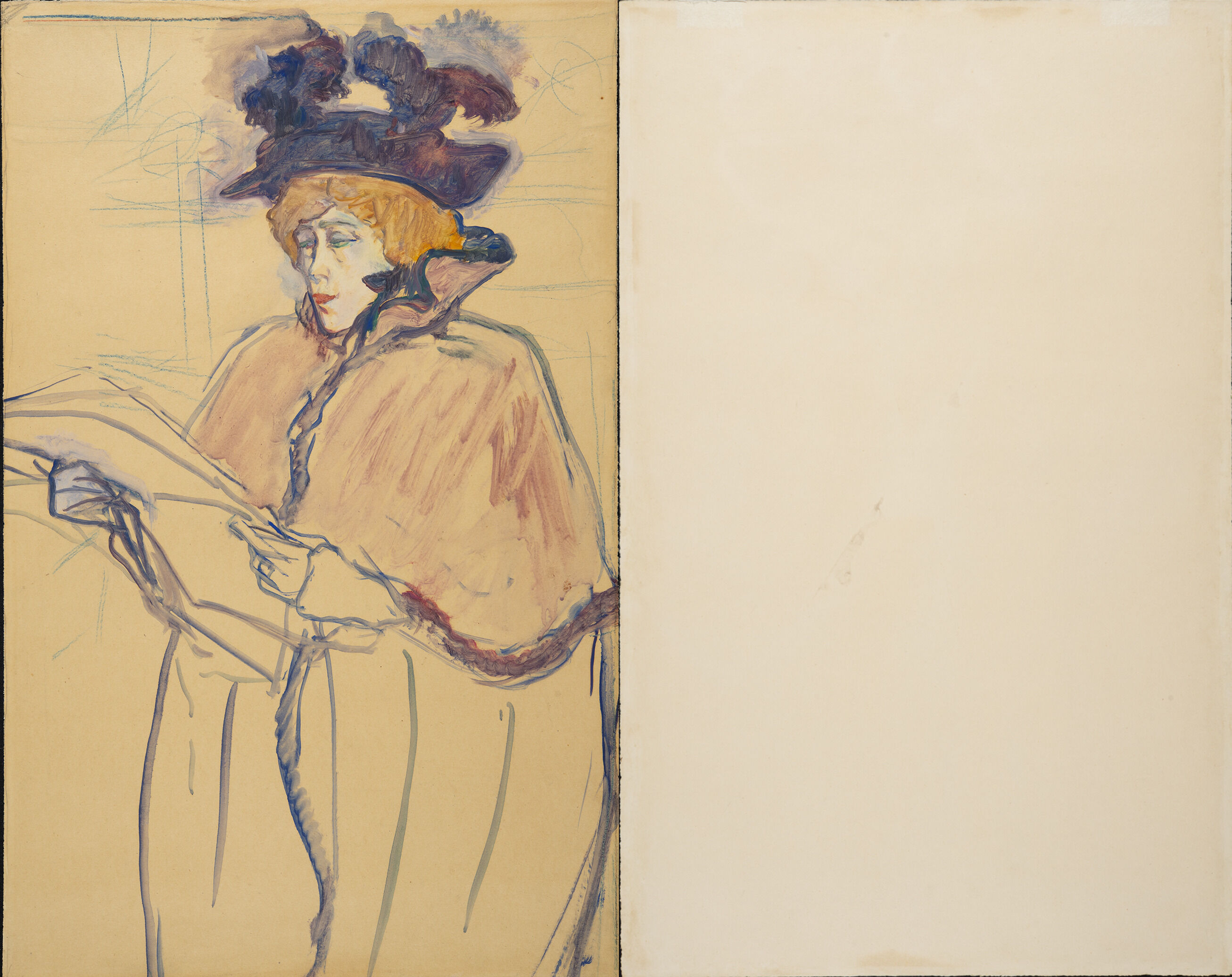 On a formal level, Jane Avril Looking at a Proof distinguishes itself from the Estampe originale cover through its pared-down detail and “hesitation-free execution.”12I borrow this term from Luciano Migliaccio, “Toulouse-Lautrec at MASP: The Scandalous Trace of Freedom,” in Adriano Pedrosa, ed., Toulouse-Lautrec: Em vermelho [in red], exh. cat. (São Paulo: Museu de Arte de São Paulo Assis Chateaubriand, 2017), 60–72, at 63. Although the sketch was included in François Daulte’s monograph French Watercolors of the 20th Century (1968), it is not, in fact, a watercolor.13See François Daulte, French Watercolors of the 20th Century (New York: Viking, 1968), 36–37. Employing a technique known as peinture à l’essencepeinture à l’essence: De-oiled paint. Peinture à l’essence was produced by the artist by leaching much of the linseed oil out of commercial paints and mixing the resulting thickened paint with turpentine. The resulting paint could be applied as a wash and dried more quickly than unmodified paint., Toulouse-Lautrec diluted oil paint with a solvent (probably turpentine), allowing him to apply pigment swiftly over the paper support.14See technical notes by Nancy Heugh, Heugh-Edmondson Conservation Services, December 18, 2016, NAMA conservation files. This rapid brushwork is particularly evident in Avril’s feathered hat and bright red hair. Whereas in the Estampe originale cover her headwear is solid black, unmodeled, and clearly silhouetted, in the sketch it is a muddle of aubergine, mauve, and indigo, heightening its sense of texture and blurring its profile.15Here, I am describing the shades of purple seen in Avril’s headwear, rather than identifying specific dyes present in the Nelson-Atkins sketch. Likewise, the spatter pattern that gives volume to Avril’s coiffure in the lithograph contrasts with the jagged, irregular strokes above her ear in the oil sketch. While these differences stem from the possibilities and limitations of each medium, the painting nevertheless possesses a raw immediacy unmatched in the lithograph.
