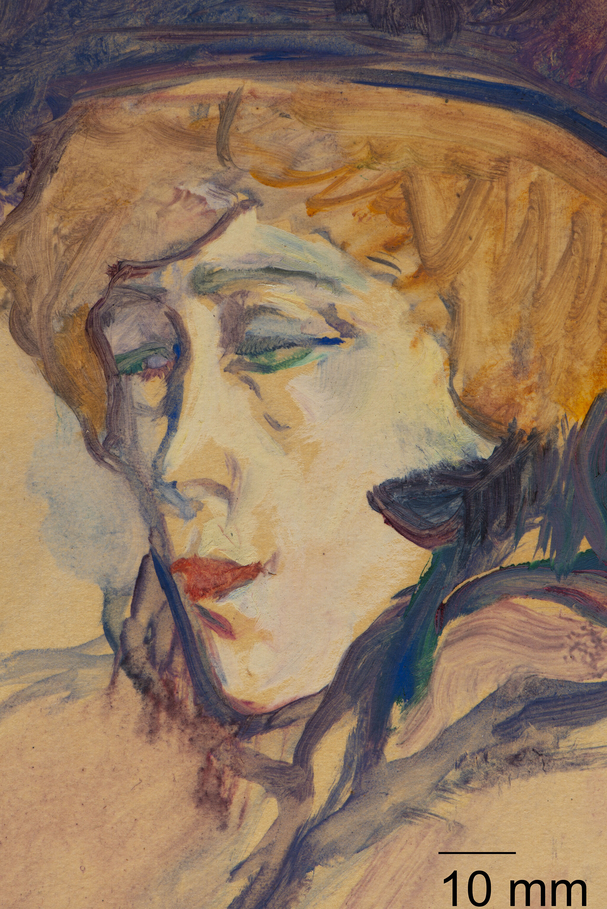 Jane Avril Looking at a Proof was edge mounted; however, the acidic and degraded brown paper backing was removed in a 2016 conservation campaign. Except for possible fading of the pigments and staining from an acidic face mat, the painting is in good condition.
