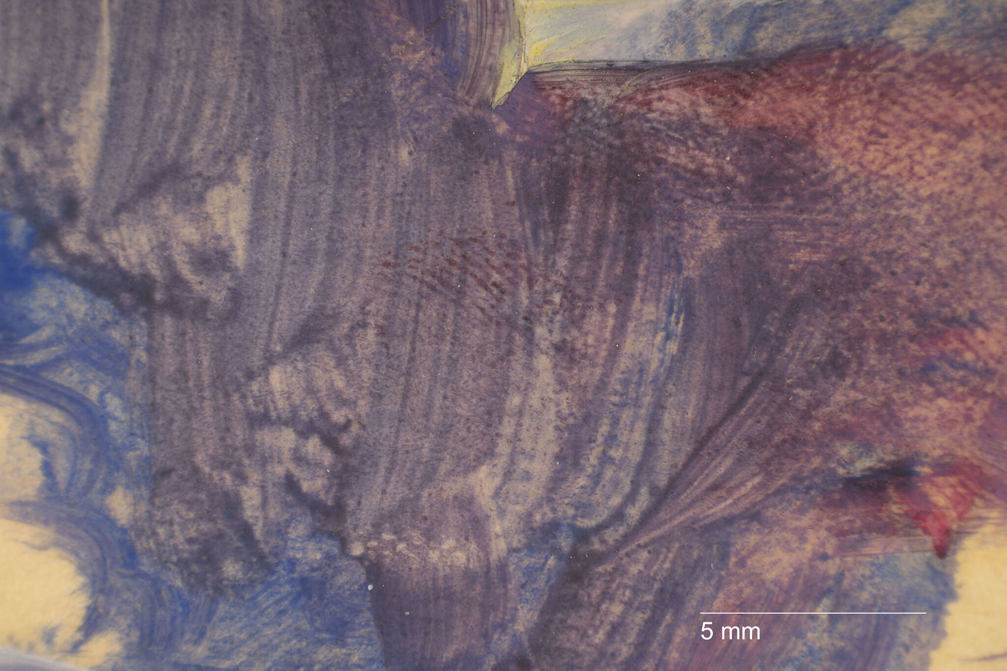 Here, I am describing the shades of purple seen in Avril’s headwear, rather than identifying specific dyes present in the Nelson-Atkins sketch.