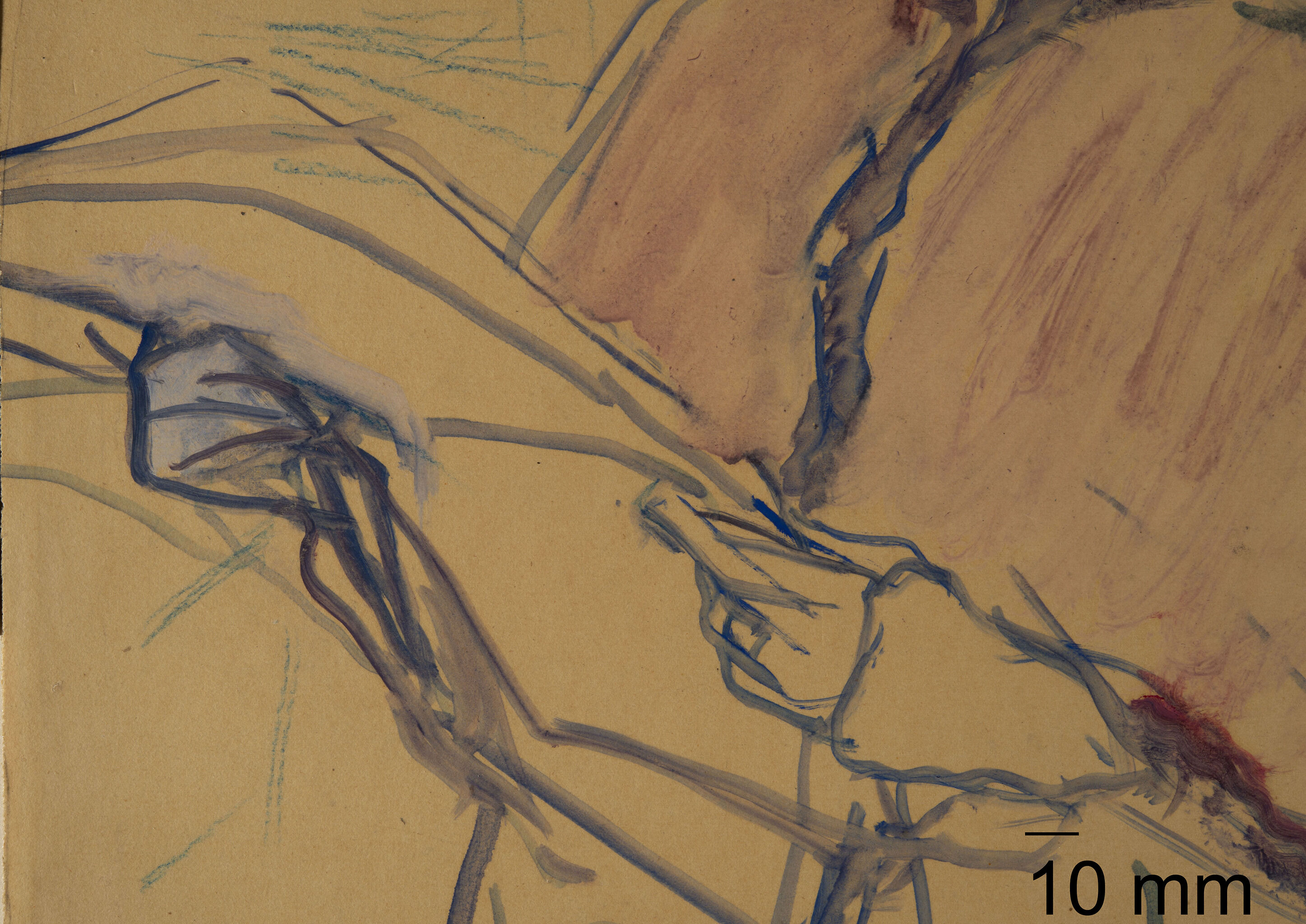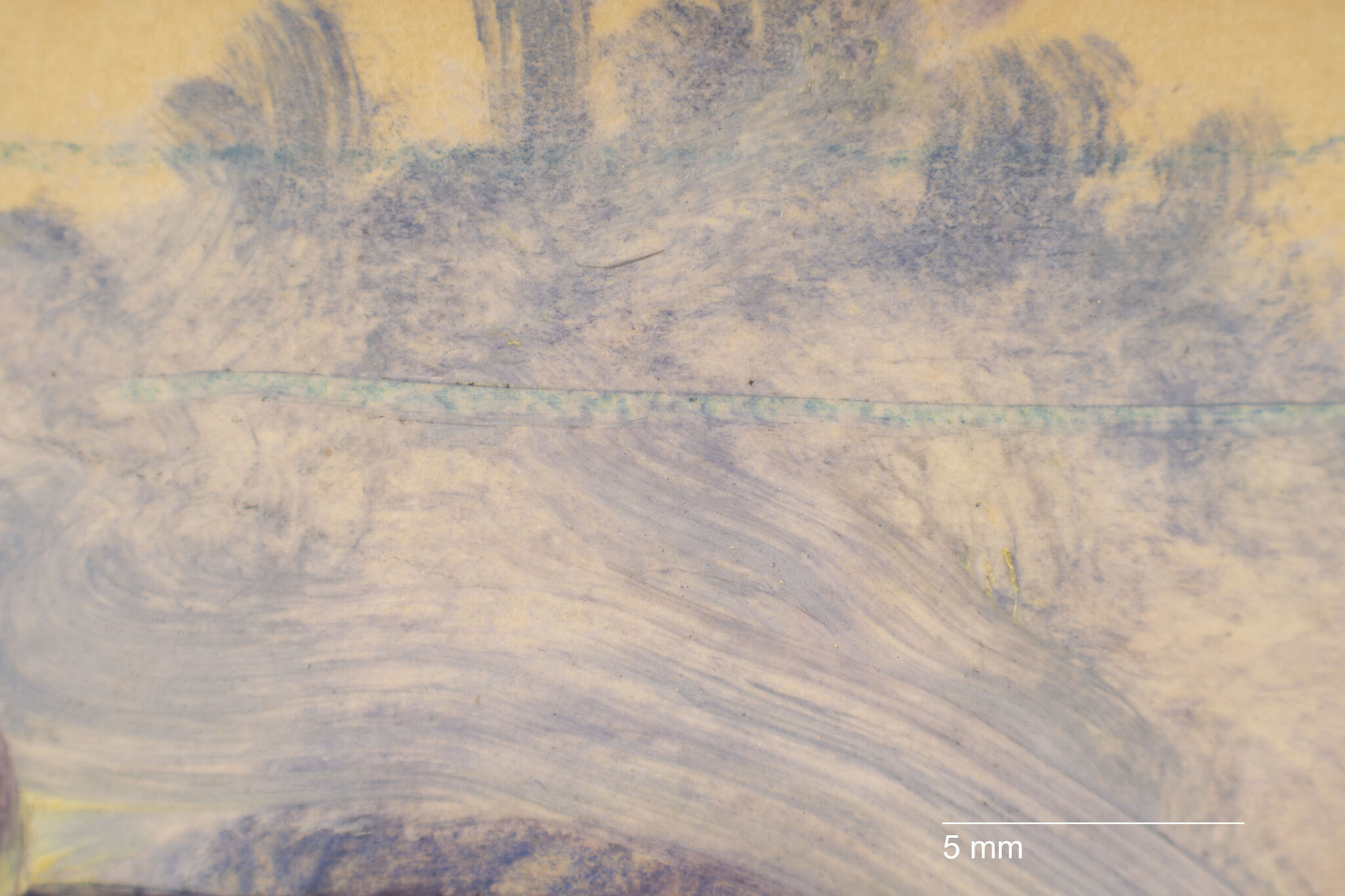 Fig. 10. Photomicrograph of Jane Avril Looking at a Proof (1893) showing the crayon line along the upper edge of the work. This line cuts through the wet paint.