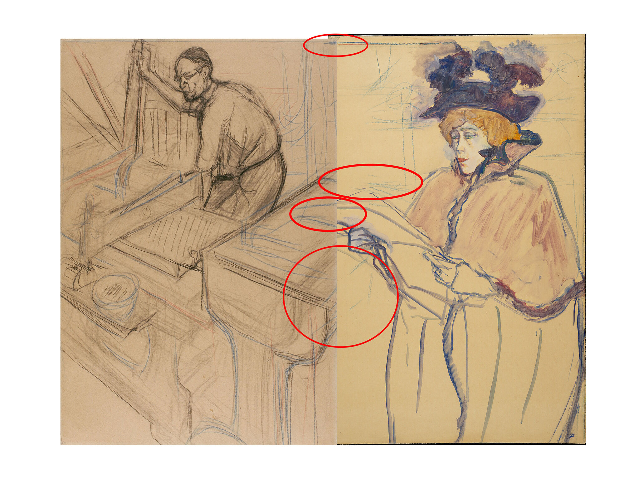 Fig. 13. In this image, the size ratio between Study and Jane Avril Looking at a Proof (1893) has been adjusted, and the drawings are overlapped to show how they correspond with the print. The red lines indicate the keystone lines in the lithograph, and the composite image shows how close Lautrec’s painted and drawn lines are to the major compositional features in the print.