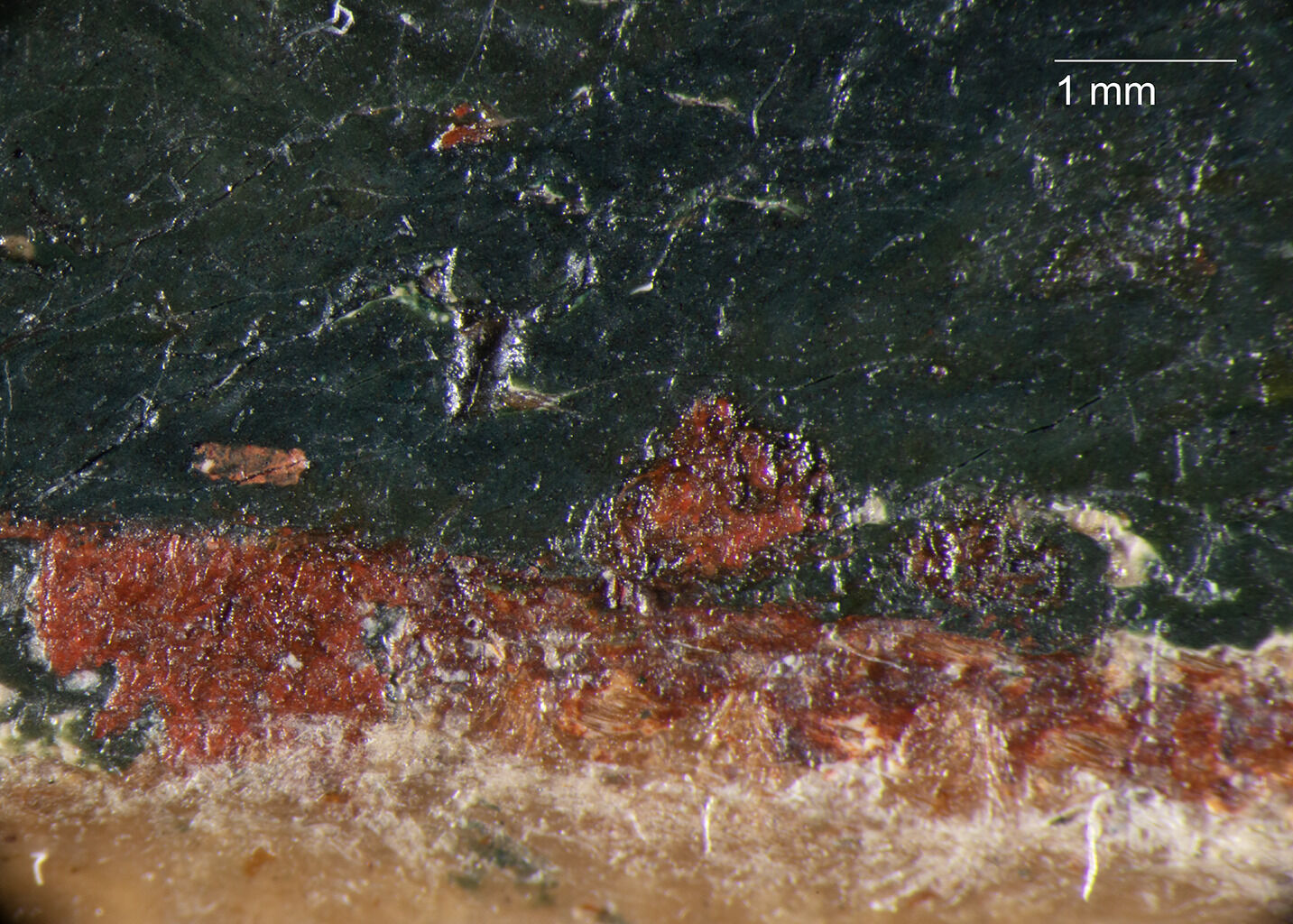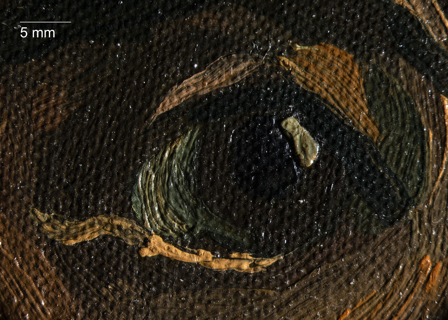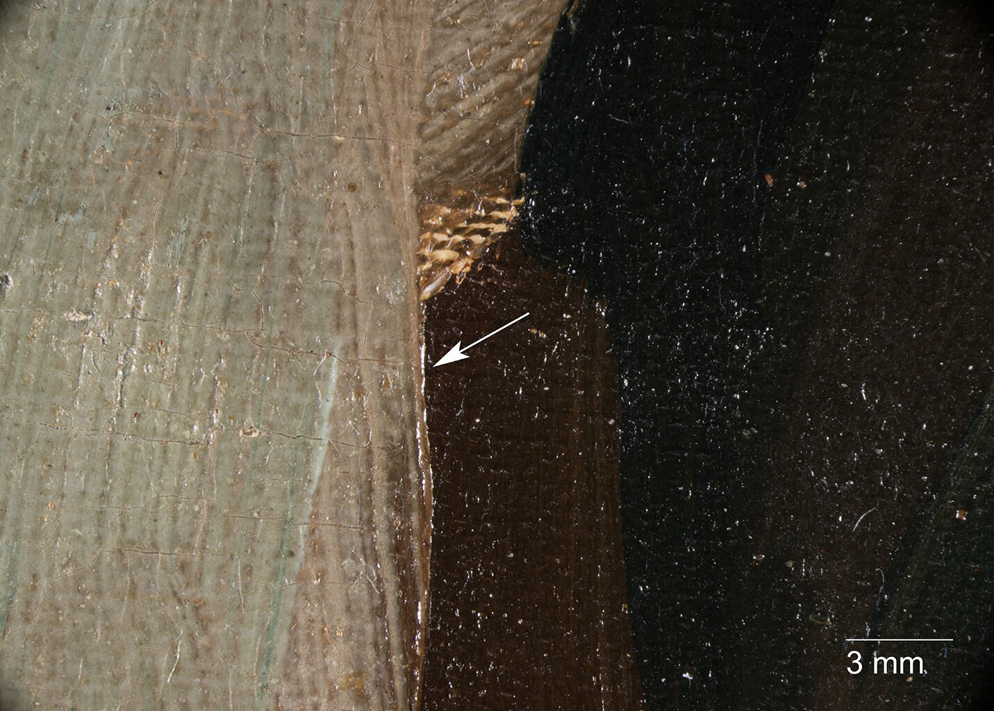 Although the tacking marginstacking margins: The outer edges of canvas that wrap around and are attached to the stretcher or strainer with tacks or staples. See also tacking edge. are no longer present and the painting is linedlining: A procedure used to reinforce a weakened canvas that involves adhering a second fabric support using adhesive, most often a glue-paste mixture, wax, or synthetic adhesive., x-radiographyX-ray radiography (also referred to as x-radiography or radiography): Radiography is an examination tool analogous to the use of X-rays in medicine whereby denser components of a painted composition can be recorded as an inverted shadow image cast on film or a digital X-ray imaging plate from a source such as an X-ray tube. The method has been used for more than a century and is most effective with dense pigments incorporating metallic elements such as lead or zinc. It can reveal artist changes, underlying compositions, and information concerning the artwork’s construction and condition. The resulting image is called an x-radiograph or radiograph. It differs from the uses of X-ray spectrometry in being dependent on the density of the paint to absorb X-rays before they reach the film or image plate and being non-specific as to which elements are responsible for the resulting shadow image. confirms that the original canvas is an open, plain-weaveplain weave: A basic textile weave in which one weft thread alternates over and under the warp threads. Often this structure consists of one thread in each direction, but threads can be doubled (basket weave) or tripled to create more complex plain weave. Plain weave is sometimes called tabby weave. fabric.1Film-based x-radiograph, no. 503, April 16, 2015, NAMA conservation file, 37-1. While there are limited opportunities to view the ground layerground layer: An opaque preparatory layer applied to the support, either commercially or by the artist, to prevent absorption of the paint into the canvas or panel. See also priming layer., its elemental composition appears to be lead-based and unlikely to include calcite or barium sulfate, common white pigments employed in the ground layers of nineteenth-century paintings, whose absence can be inferred from elemental mapping by X-ray fluorescence spectrometry (MA-XRF)X-ray fluorescence spectrometry elemental mapping (MA-XRF) or XRF elemental mapping: A non-destructive technique that entails collecting thousands of X-ray fluorescence spectra at regular intervals across a painting to build an alternate set of images depicting the locations and amounts of different elements. Although the information is fundamentally the same as measurements gathered from a single-point XRF, the graphical nature of the result is often a more powerful technique for understanding trends in an artist’s use of materials. The high number of spectra allows statistical manipulations of the elemental information to locate correlations between different pigments that would not be possible from a small number of tests. For example, the consistent occurrence of mercury along with chromium, and iron along with copper, could show that vermilion was used to mute the chrome green and red ocher was similarly employed in a mixture that includes emerald green. The resulting correlation maps then serve to show where the two cases occur in the composition. MA-XRF can also reveal preliminary paint applications that became covered as the composition was completed, thereby disclosing aspects of the painter’s method.. The even density of the ground layer visible in the x-radiograph and the strong cuspingcusping: A scalloped pattern along the canvas edges that relates to how the canvas was stretched. Primary cusping reveals where tacks secured the canvas to the support while the ground layer was applied. Secondary cusping can form when a pre-primed canvas is re-stretched by the artist prior to painting. at the right edge imply that the canvas was cut from a commercially prepared roll (Figs. 8, 9). The canvas weave revealed in x-radiography was studied in detail using automatic thread counting software, conducted in partnership with the Thread Count Automation Project.2C. Richard Johnson Jr., Don H. Johnson, and William A. Sethares, “Study of a Peasant’s Head, Vincent van Gogh, 1885 (F165 / 37-1), from the Nelson-Atkins Museum of Art,” unpublished thread count report, June 2023, NAMA conservation file, 37-1.,3For an overview of automated thread counting and Van Gogh’s canvases, see Ella Hendriks, C. Richard Johnson Jr., Don H. Johnson, and Muriel Geldof, “Automated Thread Counting and the Studio Practice Project,” Van Gogh’s Studio Practice, ed. Marije Vellekoop, Muriel Geldof, Ella Hendriks, Leo Jansen, and Alberto de Tagle (New Haven: Yale University Press, 2013), 156–81. The resulting average thread count, 16.0 threads per centimeter in the horizontal (weft) direction and 13.8 threads per centimeter in the vertical (warp) direction, appears to be consistent with thread counts acquired by hand on other canvases painted while Van Gogh resided in Nuenen.4Ella Hendriks and Muriel Geldof, “Van Gogh’s Antwerp and Paris Picture Supports (1885–1888): Reconstructing Choices,” Art Matters: Netherlands Technical Studies in Art 2 (2002): 45. At the date of this comparison (June 2023), there are no weave spacing matches between the Nelson-Atkins painting and other works by Van Gogh from this period that have been similarly studied and could have been cut from an adjacent position in the same roll.