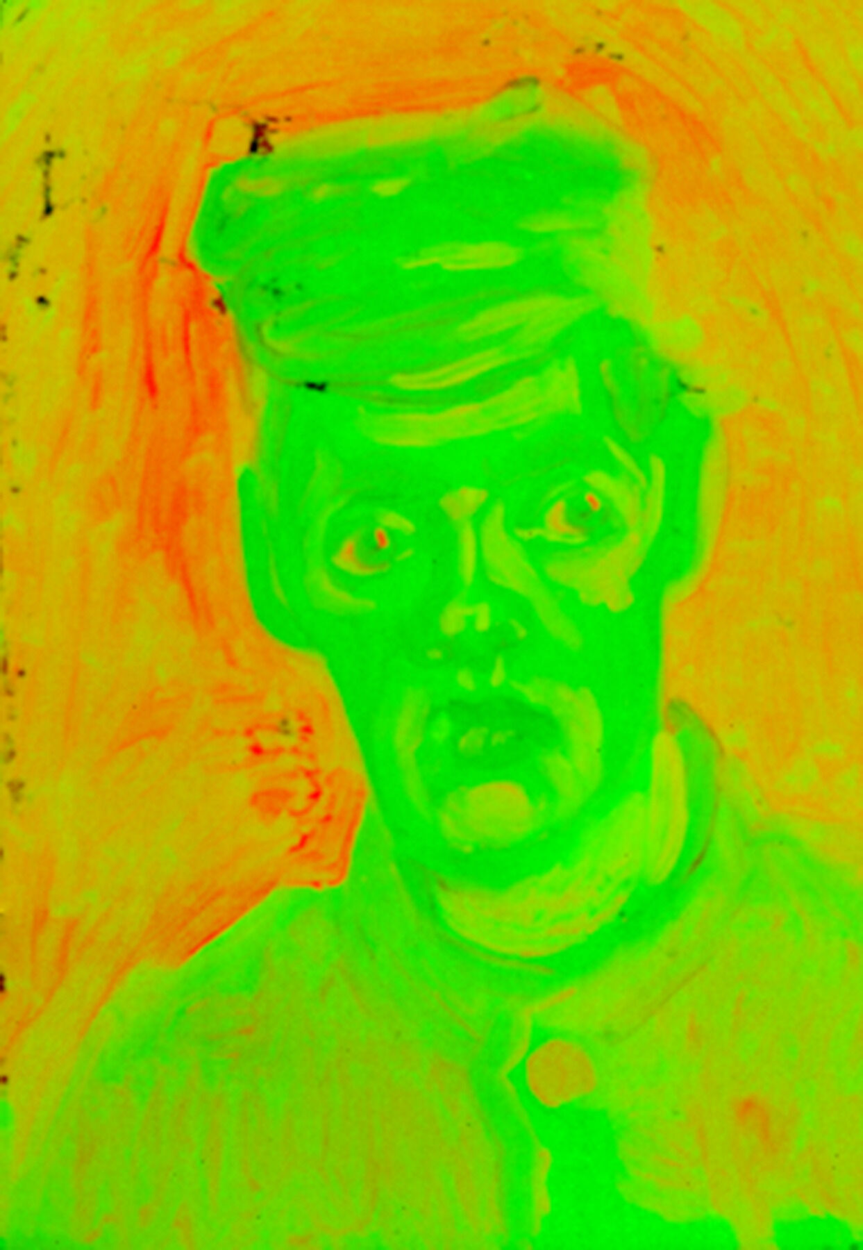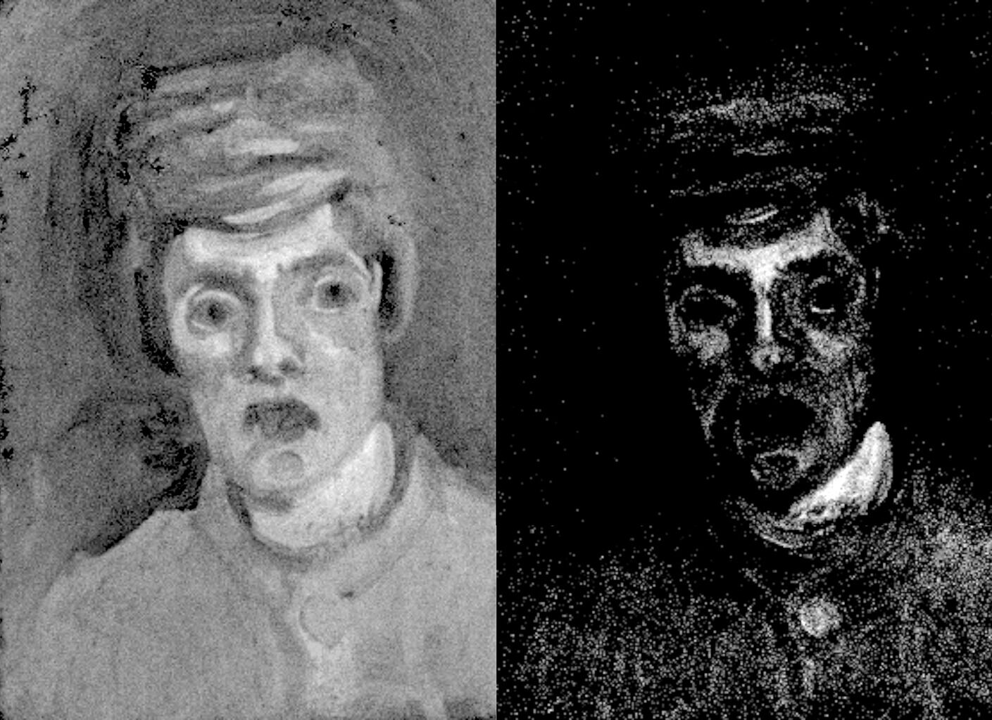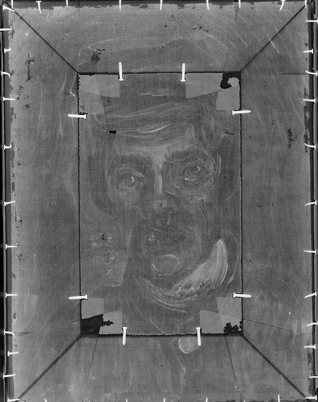 Fig. 9. Radiograph of Head of a Man (1885), a composite of two radiographs captured at different exposures in order to minimize the thick, underlying stretcher members
