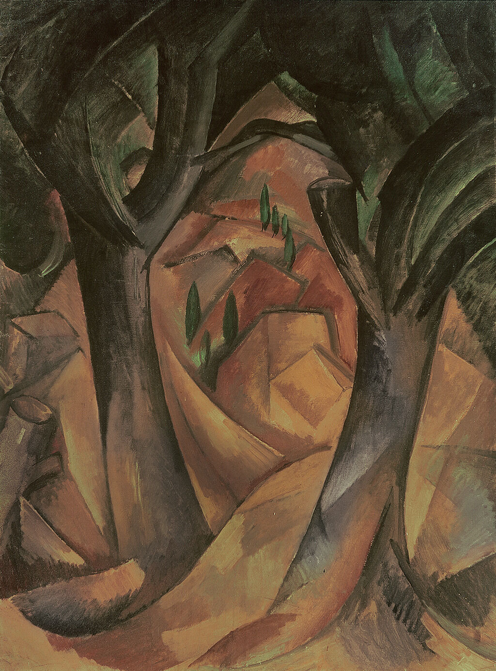 Fig. 5. Georges Braque, Trees at L’Estaque, summer 1908, oil on canvas, 31 5/8 x 23 11/16 in. (80.3 x 60.2 cm), Metropolitan Museum of Art, New York. Promised Gift from the Leonard A. Lauder Cubist Collection, SL.17.2014.1.2. © 2024 Artists Rights Society (ARS), New York / ADAGP, Paris
