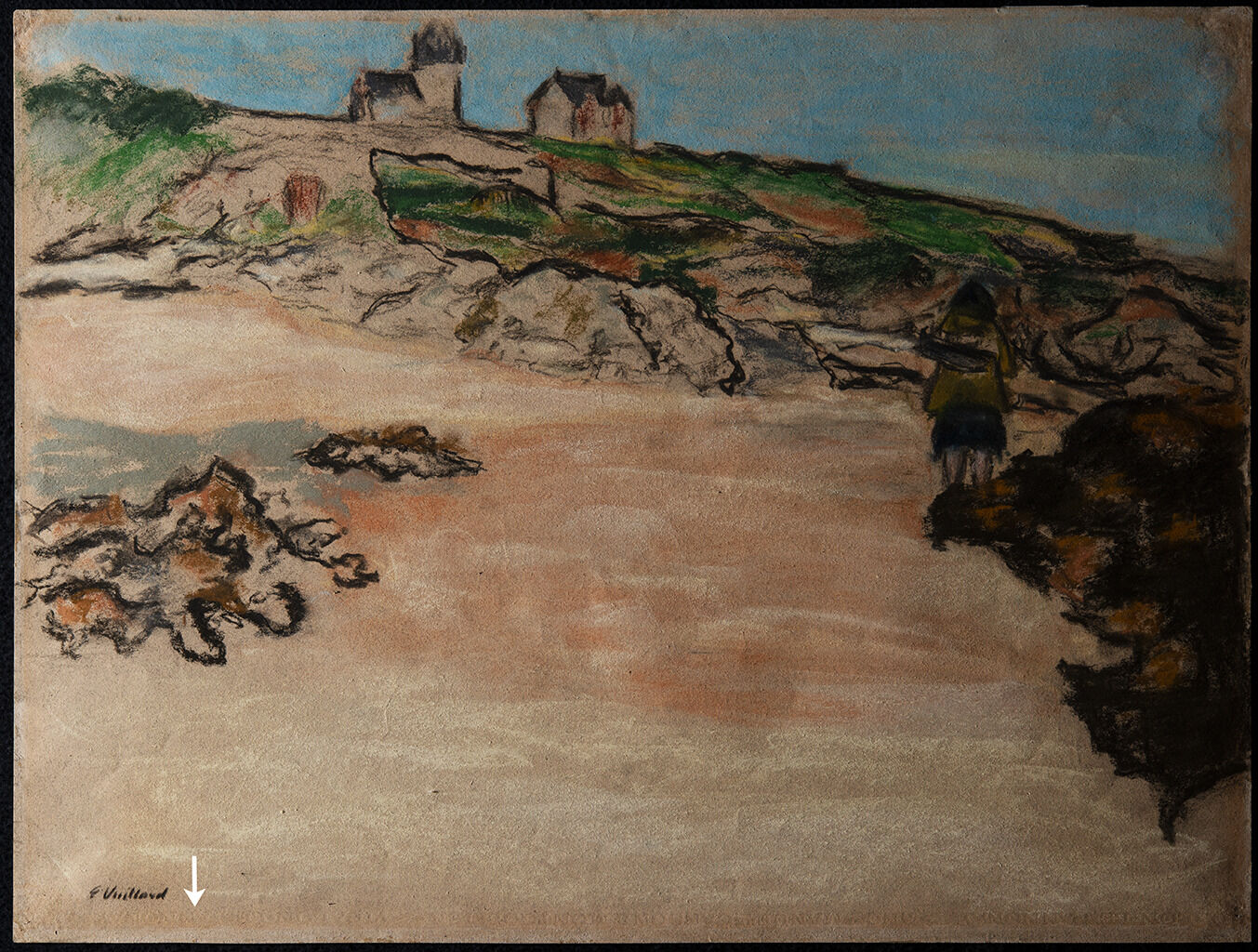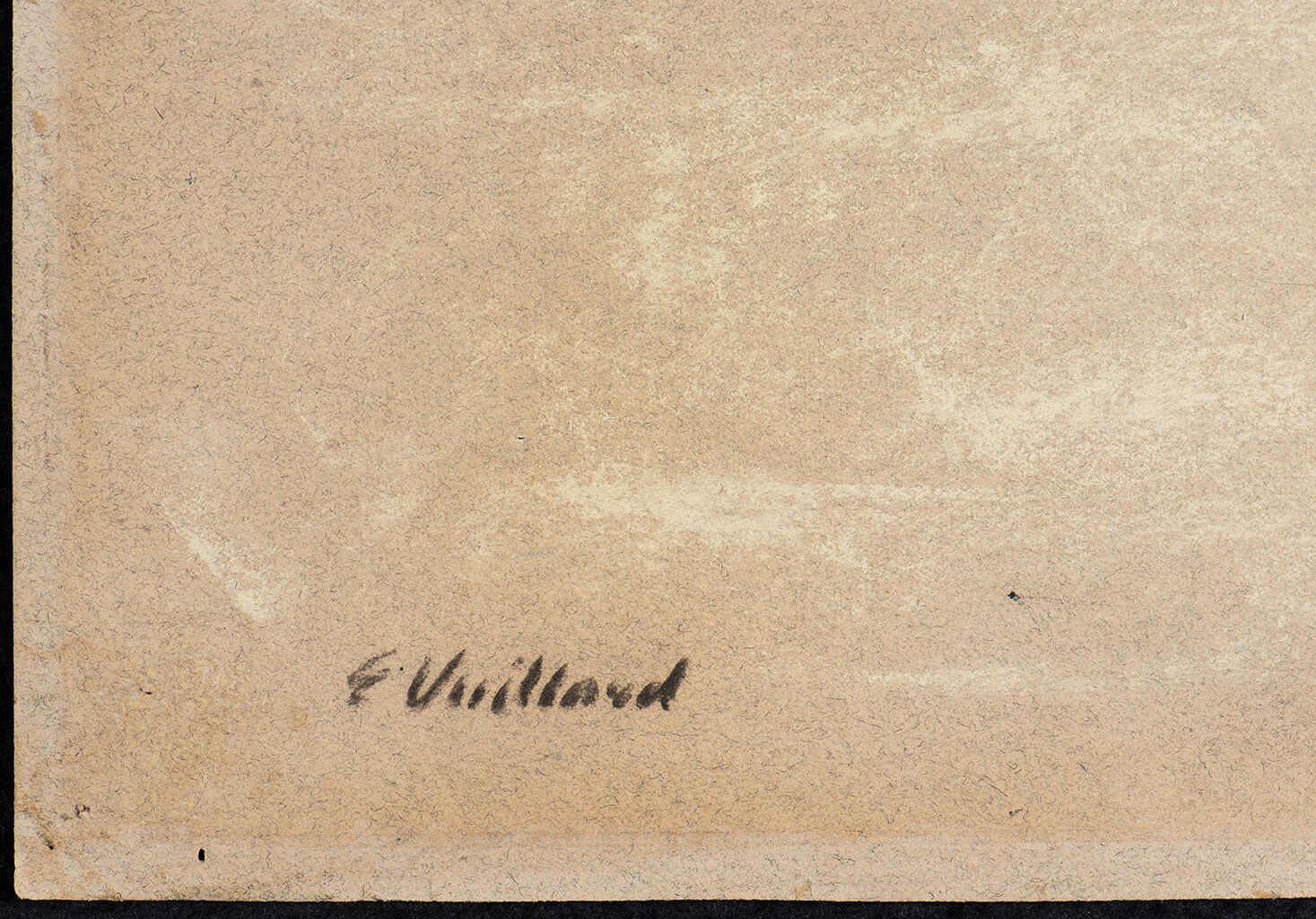Vuillard signed the artwork in vine charcoalvine or willow charcoal: Long, thin charcoal sticks created by burning grape vines or willow twigs in a low carbon environment. Vine and willow charcoal produce brown to black shades. With magnification, the pastel particles often have a splintered appearance and display a characteristic sparkle. at lower left. This is the only incidence of the media in the artwork. The signature is well adhered to the paper and underlying layers of pastel and may have been fixed post execution (Fig. 8).