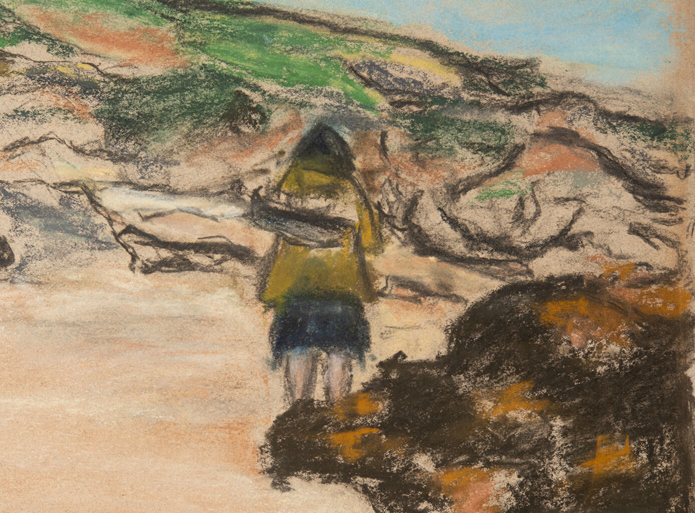 Vuillard’s palette is evocative of a bright day with light reflecting off sand and water, and the colors he chose may be the result of the study of the landscape and architecture of the seashore, as well as the garb of people who work close to the water. Foreground colors are simplified to muted browns, ochers and reds, grays, light yellows, and black. The beach consists of sparsely applied yellow and dull-red pastels, with a muted blue to indicate shallow tidal pools. Toward the fore edge of the paper, the pastel application thins and the color of the paper dominates. Green and light blue in the background contrast with the palette of the beach and fisherwoman and emphasize the distant horizon. The background and hillside have some solidity due to heavily applied dark green pastel color. Brighter greens and olive tones applied in strokes of varying weight indicate grass and other foliage. Objects seen from a distance, such as the houses, are indicated with just a few strokes of blue and a rusty red, often applied over black to create a gray. The horizon is a gently blurred black line.