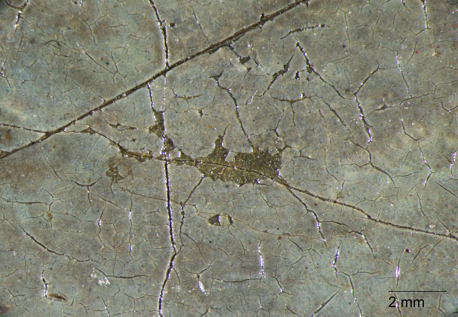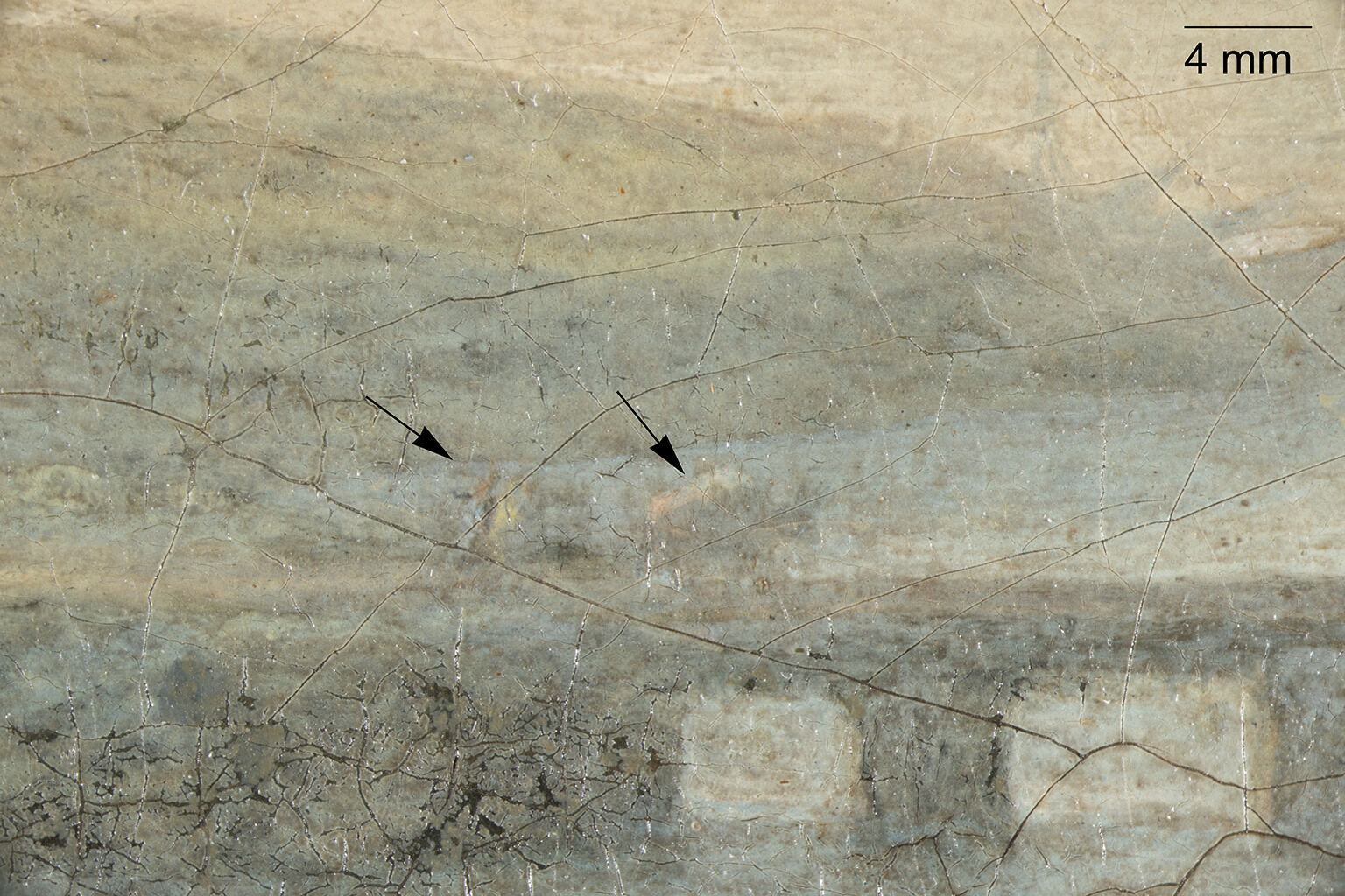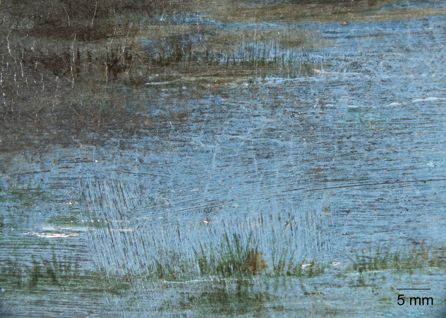 The majority of pigment particles throughout the painting are small in size, sometimes causing complications in the identification of pigments. While metal soaps were not abundant on this painting or Landscape with a Piping Shepherd, reaction products of lead with chloride and sulfate were often found atop the paint layer. The combination of fine particles with high surface area and lead mobilization to form these reaction products on the surface may have been the cause of blanching. In addition, the use of pre-industrial cleaning products, such as alkaline soaps, during historical restorations may have supplied some of the reactants contributing to the whitish appearance. In the case of Mill on the Tiber, additional uneven cleaning techniques may have resulted in the localized removal of blanching or localized formation of blanching (Fig. 15).