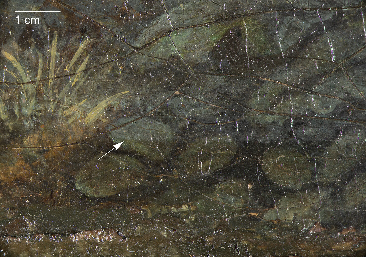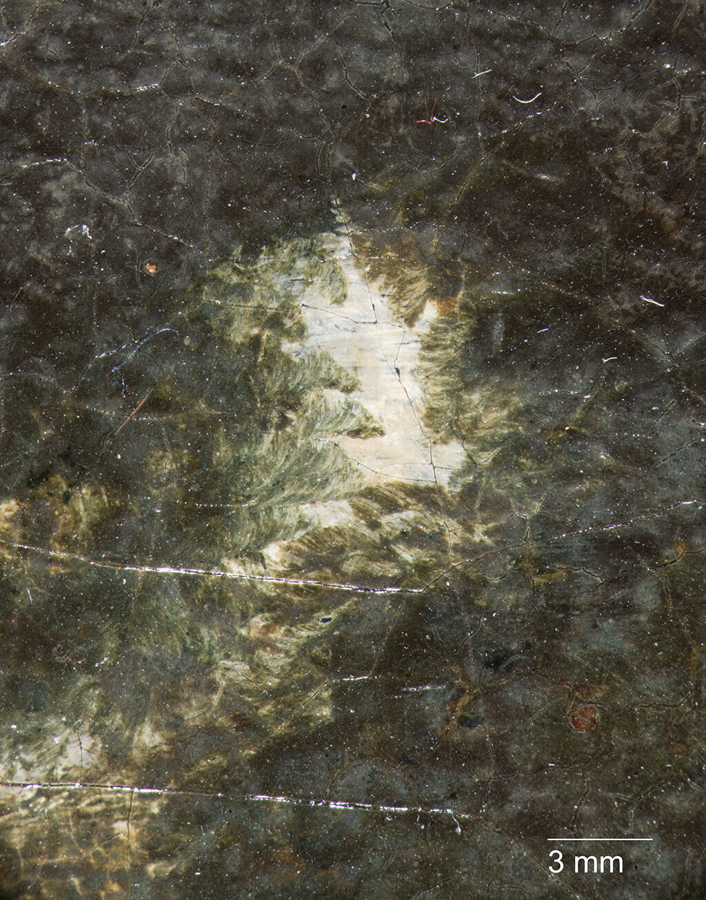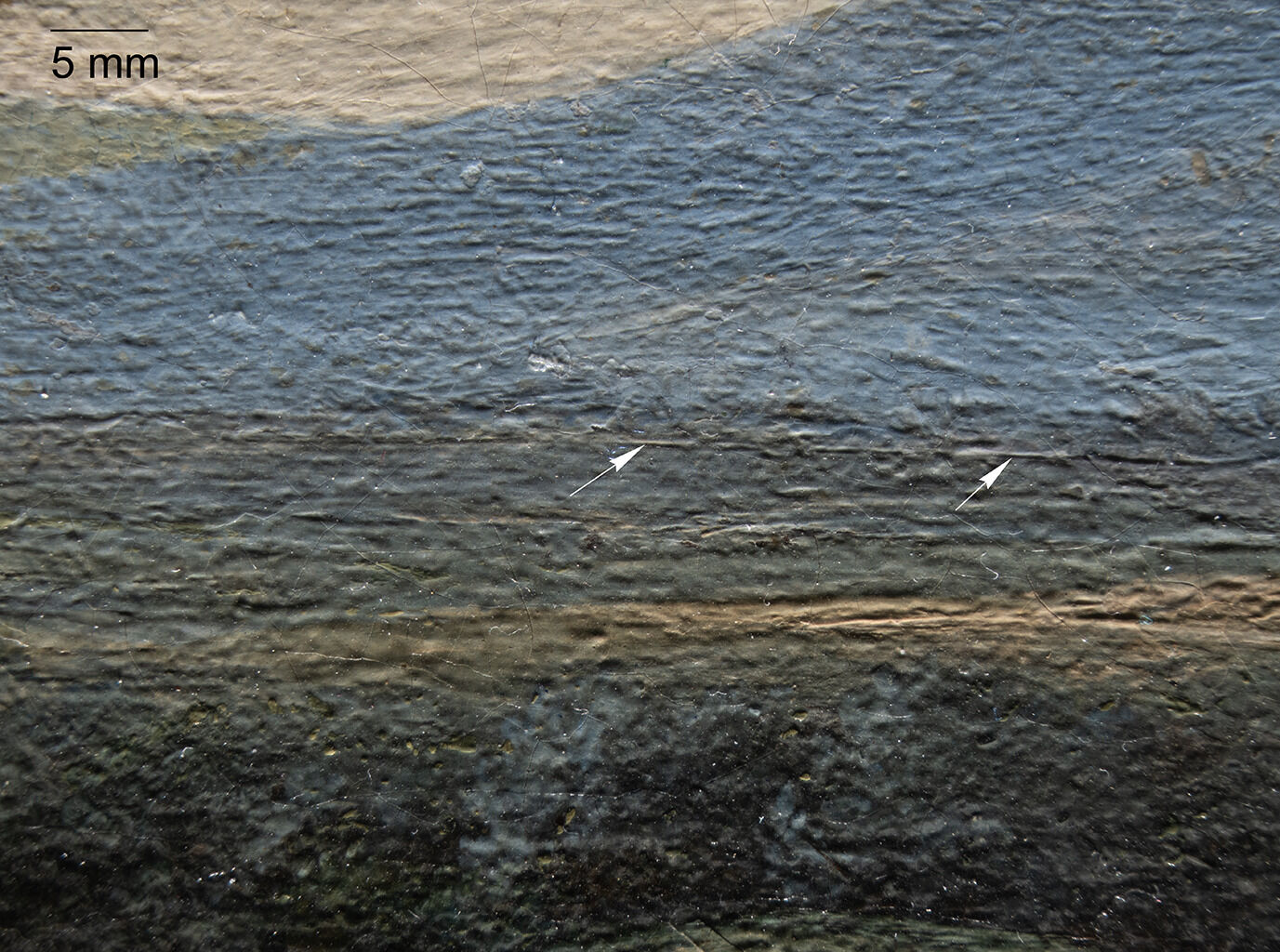 Fig. 8. Photomicrograph of the water, illustrating textured brushwork and the dark preparatory layer, Mill on the Tiber (ca. 1650)