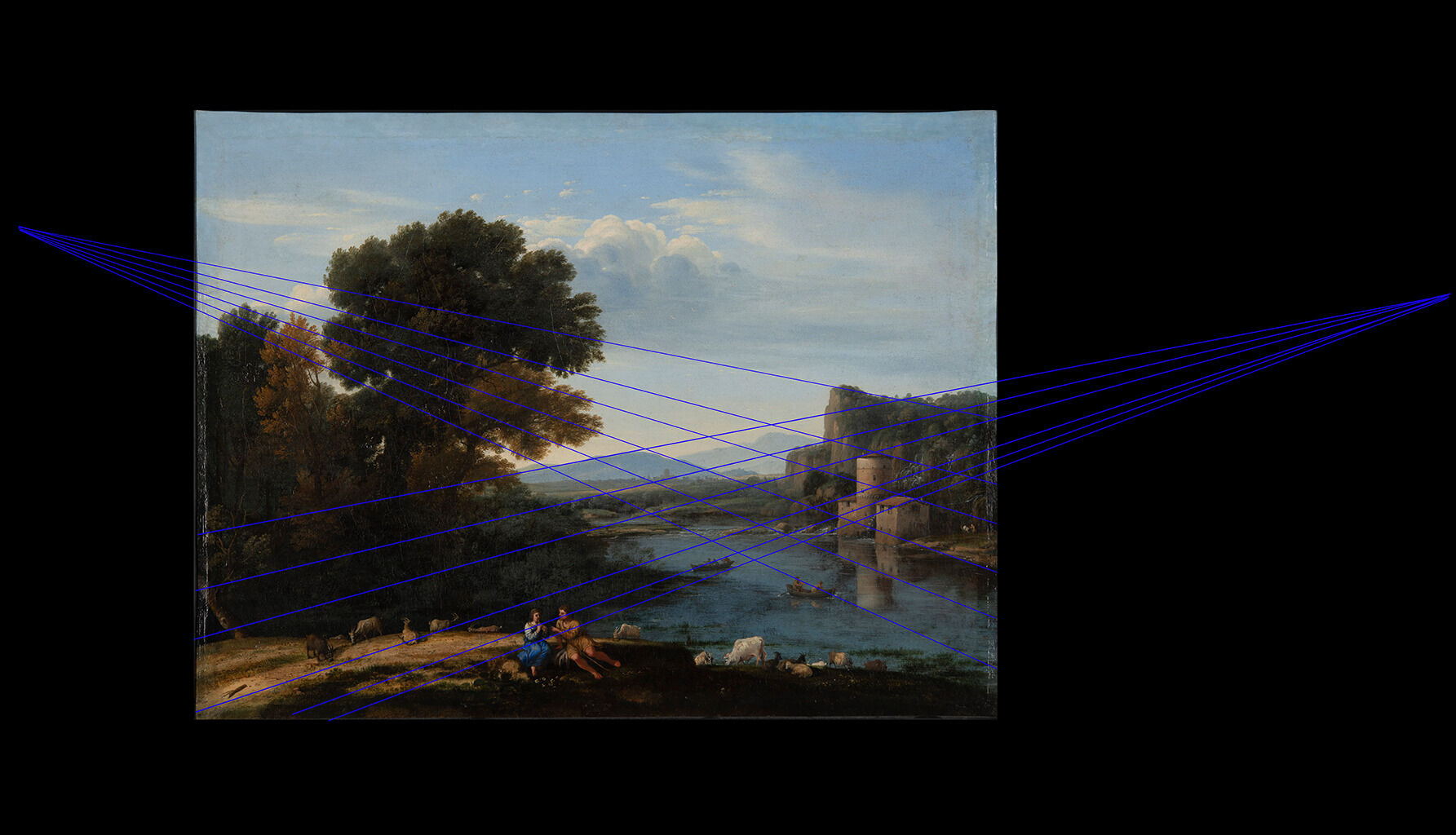Fig. 10. Perspective diagram illustrating vanishing points that extend past the picture plane of Mill on the Tiber (ca. 1650)