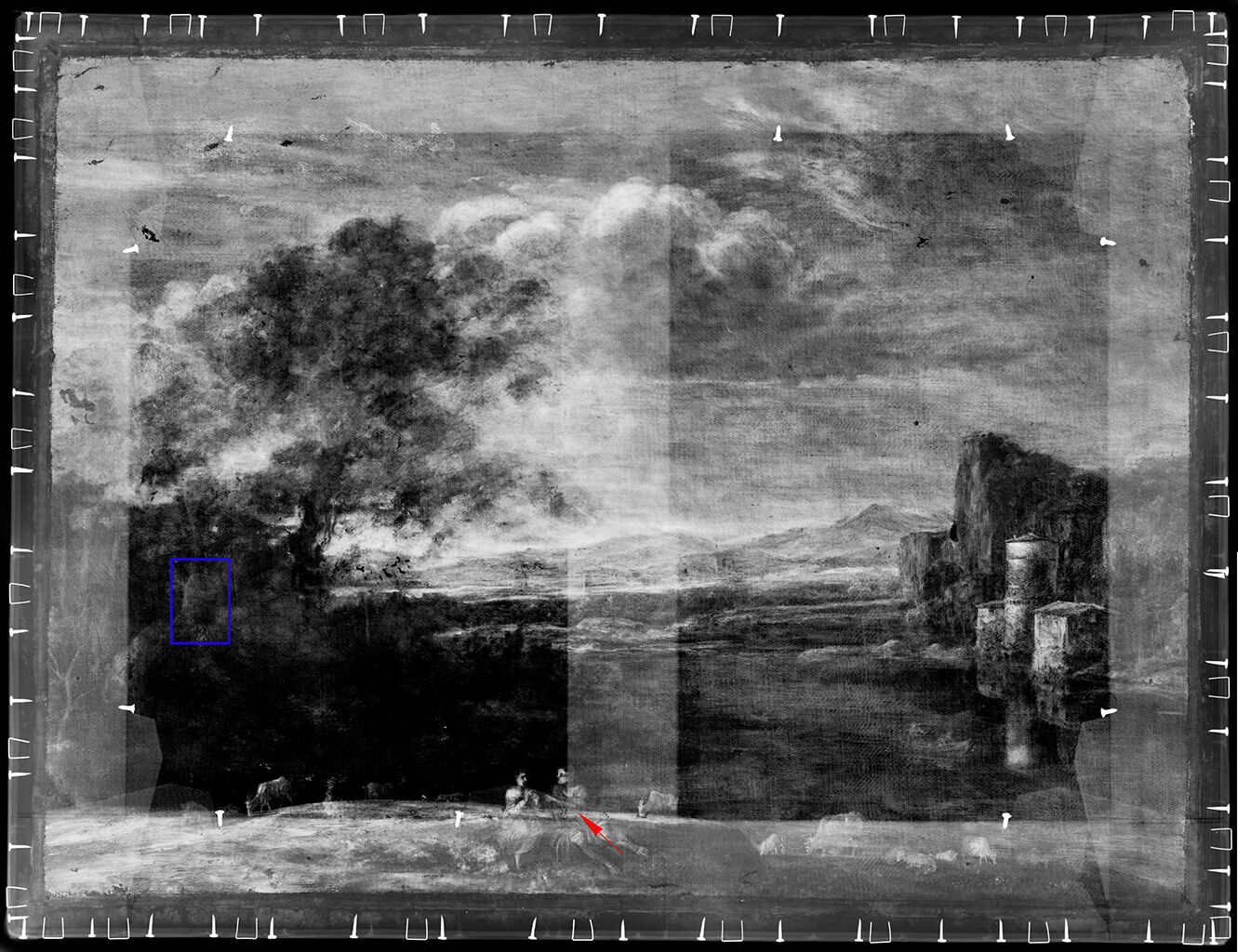 Fig. 11. X-radiograph of Mill on the Tiber (ca. 1650), with a blue box around a possible artist change of a tree trunk and a red arrow indicating the landscape application beneath the figures