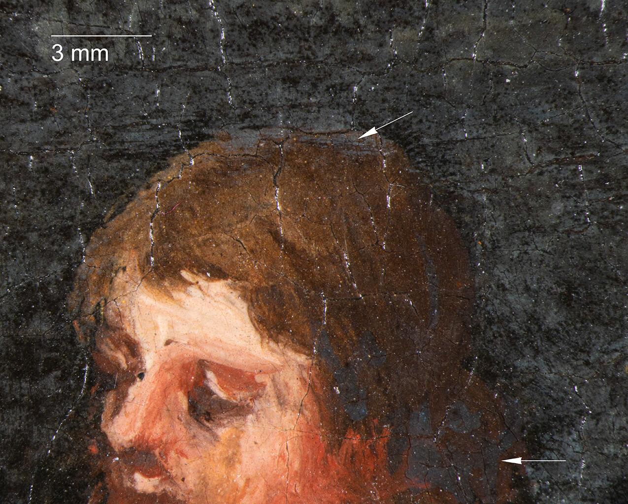 Fig. 14. Photomicrograph of blanching crossing the hair of the main male figure, Mill on the Tiber (ca. 1650)