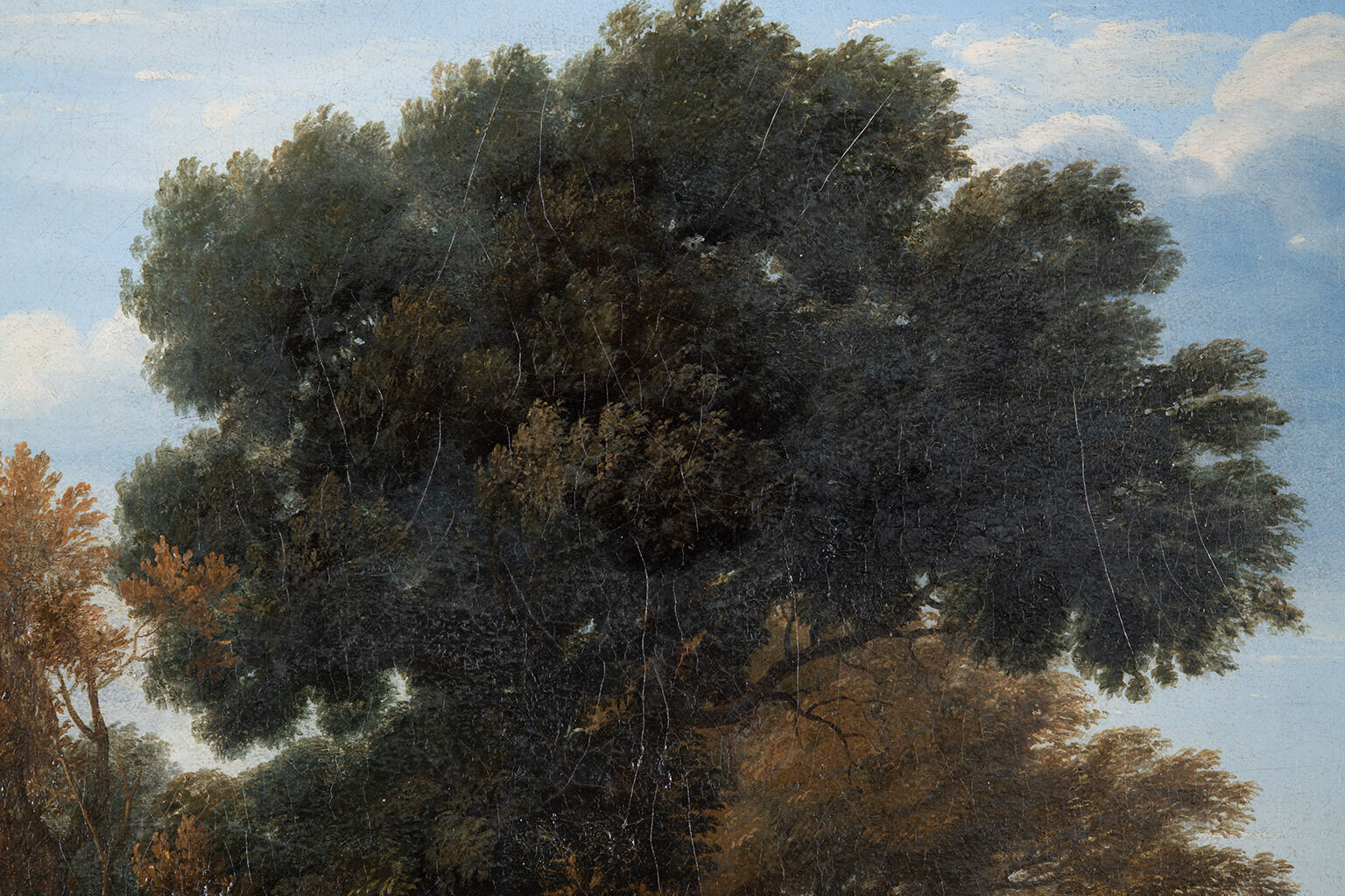 The painting has an elaborate restoration and conservation history, making it unclear precisely how it appeared when it was first completed. The earliest documented conservation treatment dates to 1942/1943, when the painting was cleaned and relined with wax by James Roth.12James Roth, September 11, 1943, treatment report, NAMA conservation file, 32-78.,13A document in the NAMA curatorial file also mentions a 1933 treatment of a Claude Lorraine [sic] painting, which was cleaned by M. J. Rougeron, a paintings restorer based in New York. However, it is not specified by title which Claude Lorrain painting was treated, Mill on the Tiber (32-78) or Landscape with a Piping Shepherd (31-57). The painting was subsequently cleaned from 1980 to 1982 by Forrest Bailey.14Forrest R. Bailey, September 11, 1980, and September 2, 1982, treatment reports, NAMA conservation file, 32-78. Photographs captured during Bailey’s treatment document that original paint had been overpaintedoverpaint: Restoration paint that covers original paint that may or may not be damaged. Historically, overpaint has often been applied too broadly, altering the intended aesthetic of the painting and sometimes introducing conceptions foreign to the original artist, thereby altering our understanding of the work and the era to which it belongs. along the edges and was revealed during his cleaning. This original paint, however, appeared to be severely fragmented and was subsequently covered again during the 1982 treatment. Retouchingretouching: Paint application by a conservator or restorer to cover losses and unify the original composition. Retouching is an aspect of conservation treatment that is aesthetic in nature and that differs from more limited procedures undertaken solely to stabilize original material. Sometimes referred to as inpainting or retouch. and overpaint dating from this treatment do not match the milky or hazy appearance found within the adjacent foliage of the composition today, suggesting that the change in surface appearance has progressed over the forty-plus years since 1982. During that conservation campaign, a synthetic varnish was applied and appears to have darkened slightly.