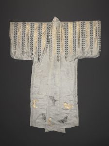 Image captions: Nō Robe with Design of Wisteria and Butterflies, Japanese, Edo period (1615–1868). Surihaku-type robe; gold and silver leaf stenciled on figured satin ground, 67 x 52 ¾ inches. Purchase: William Rockhill Nelson Trust, 32-142/5.