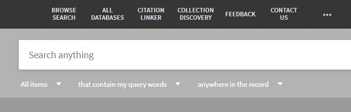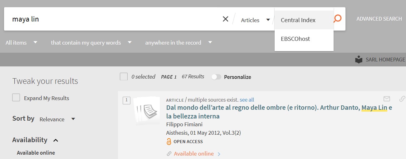 Under “Articles”, there will be a second drop-down menu with two options “Central Index” and “EBSCOhost.” Both options search articles in databases. To do a comprehensive article search, select both options.