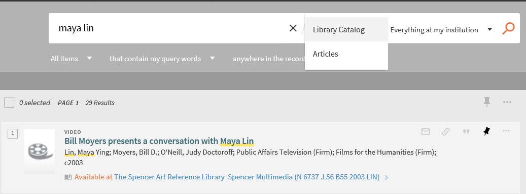 Searching across database collections: You can switch between a physical book search and a digital article search by selecting the drop-down menu labeled “Library Catalog” to the right of your search term. This will allow you to refine your search to “Articles” or “Library Catalog.” “Library Catalog” will search primarily physical items such as books, journals, etc. “Articles” will search database collections where you can find citations and full-text articles.