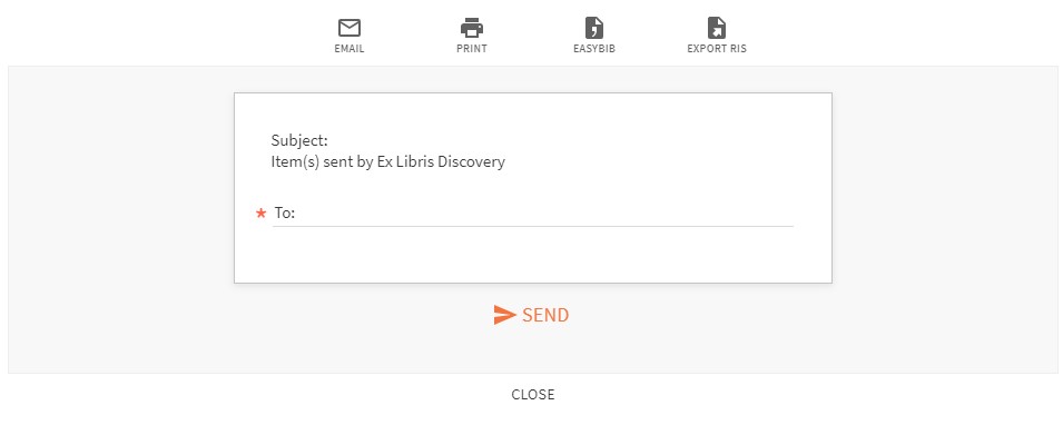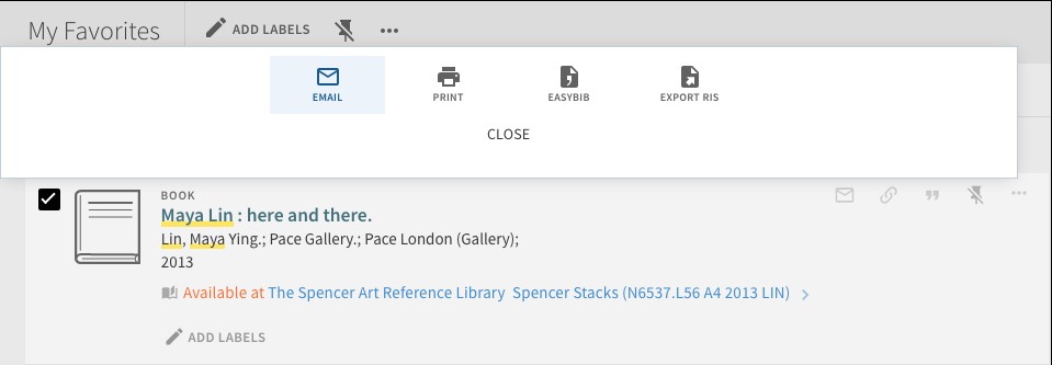 Click on the email icon and enter your email address to send the requests to yourself. Once you receive the email in your personal email account, forward the email to sarlcirc@nelson-atkins.org with your name and when you need the materials you requested by. Library staff will pull the materials by the date you requested.