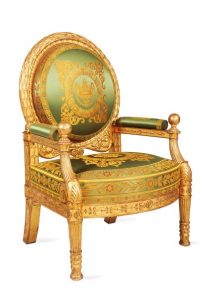 Pierre‐Antoine Bellangé, French (1757‐1827). Presentation armchair for the Grand Salon of the King of Rome’s apartment at the Tuileries, intended for the Emperor and Empress, ca. 1804–1815. Gilded wood, silk, 45 3/10 x 32 3/10 x 26 inches. Paris, Mobilier national, GMT 1228. Photo collection du Mobilier national © Isabelle Bideau.