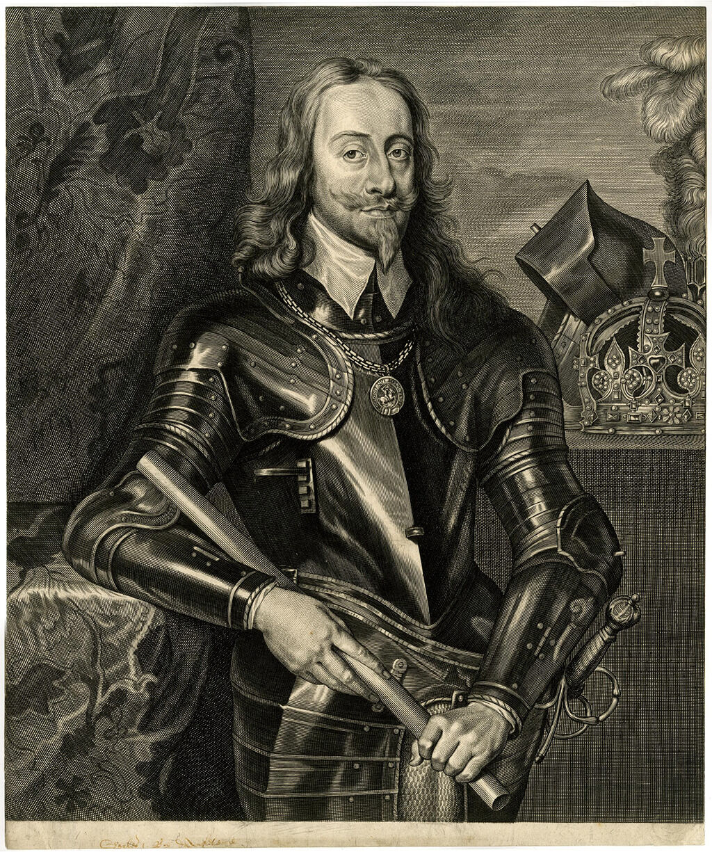 This sitter may too have been a Parliamentary: During the English Civil War (1642–1651), the Parliamentary cause was embraced by opponents of absolute monarchy who sought to depose King Charles I and later executed him., although similar cuirassier: Members of heavy cavalry who wore full plate armor into battle on chargers. There were two full Cuirassier regiments during the English Civil War: Cromwell’s Royal Horse Guards and the Earl of Essex’s Life Guards. The full plate armor worn by cuirassiers was also worn by individual cavalry officers who could afford to commission it, along with the cost of a horse capable of bearing its rider in full plate in battle. The armor was designed to withstand musket balls. armor was worn by men on both sides of the English Civil War, even by Charles II in various portraits by Sir Anthony van Dyck (1599–1641) (Fig. 1).6It has been intriguingly suggested by reader Carolin H. that the sitter bears a close resemblance to William Craven, 1st Earl of Craven (1608–1697), a Royalist and Privy Councillor to King Charles I. Of note is Craven’s portrait by the studio of Gerrit von Honthorst at the National Portrait Gallery, London, which was painted two years later. While the sitters’ clothing and armor differ, both men share similar coloring, strong noses, heavily lidded eyes (although the NPG sitter’s eyes appear to be blue or green, rather than brown) and expressions of stern resolve. See Studio of von Honthorst, William Craven, 1st Earl of Craven, 1647, oil on canvas, 28 3/4 x 23 1/2 in. (73 x 59.7 cm), National Portrait Gallery, London, NPG 4517. Additional notes in NAMA curatorial files, 2025. Certainly the Nelson-Atkins sitter had sufficient means to commission a portrait of himself as an active participant in this conflict from a noted miniaturist. Hoskins devotes attention to the variegated sheen of the steel armor, enumerating its gilt rivets and cords: Twisted or braided three-dimensional rope, often seen on or hanging from the shoulder. metal trim. Beyond its protective qualities, a suit of armor in this period was an extraordinary luxury, as soberly as it is presented to the viewer in this stark depiction of a man at war.