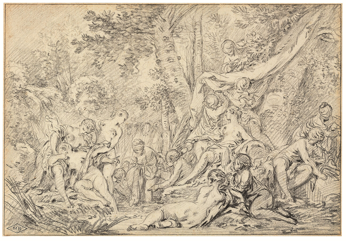 François Boucher, Diane et Callisto, 18th century, sketch in gray monochrome on canvas, 33 x 24 13/16 in. (84 x 63 cm), private collection, reproduced in Alexandre Ananoff and Daniel Wildenstein, François Boucher (Lausanne: Bibliothèque des Arts, 1976), no. 535, p. 1:204.