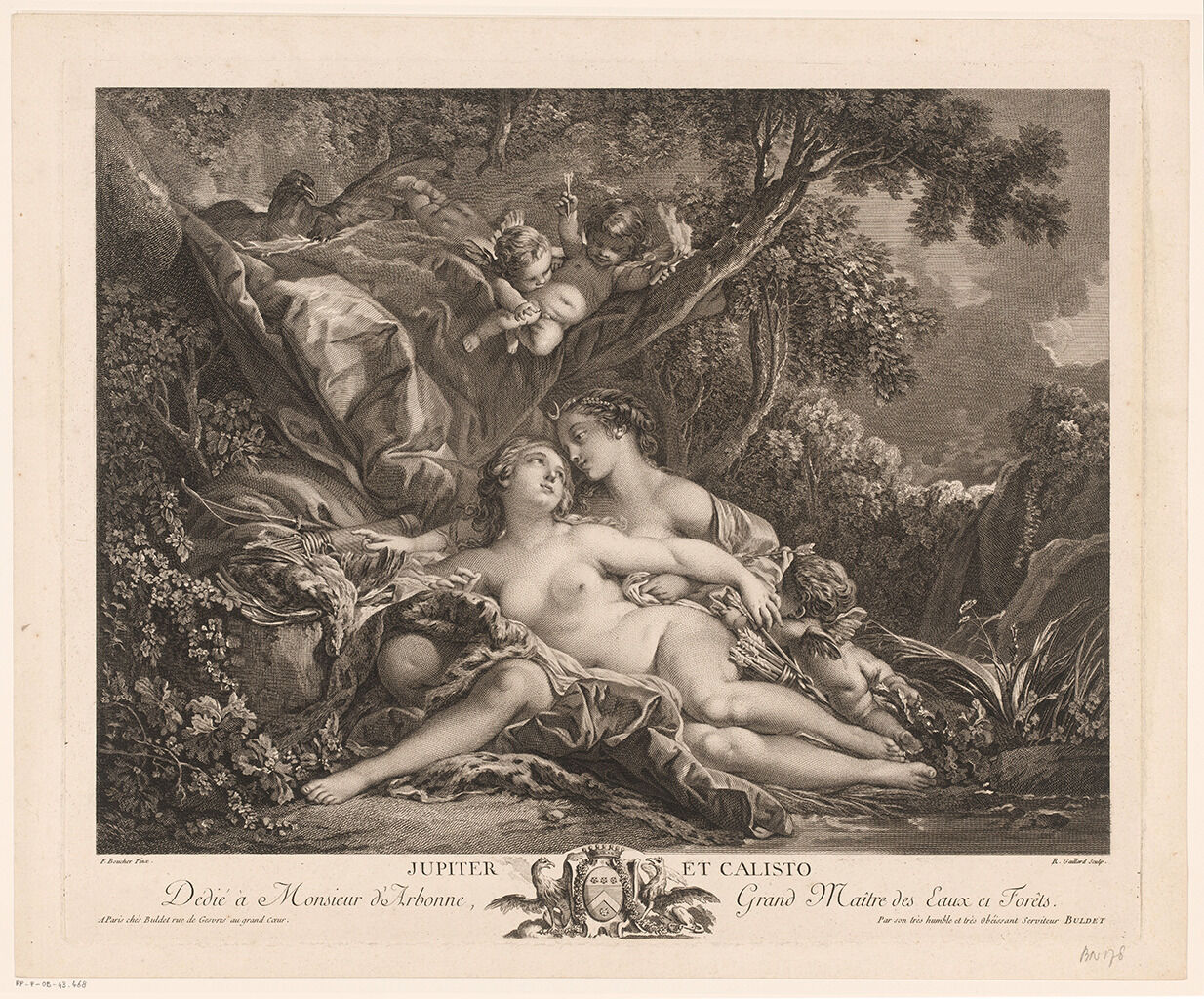 René Gaillard (ca. 1719–90), after François Boucher, Jupiter and Callisto, published 1760, etching without colophon, sheet: 16 3/10 x 19 1/2 in. (41.4 x 49.7 cm), Musée du Louvre, Paris, 18595 LR/ Recto (see also another impression, 6046 LR/ Recto).