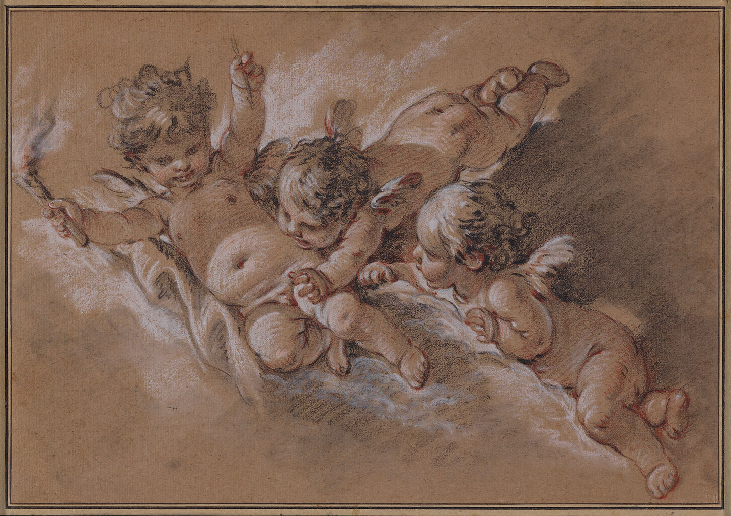 François Boucher, Three Putti in the Clouds, ca. 1759, black, white, and red chalk on buff paper, 7 7/8 x 11 3/8 in. (20 x 28.7 cm), The Nelson-Atkins Museum of Art, Kansas City, Missouri, 83-27, acquired through the generosity of Helen Cronin Bourke and Elaine Bourke Lally in honor of Ross E. Taggart,.