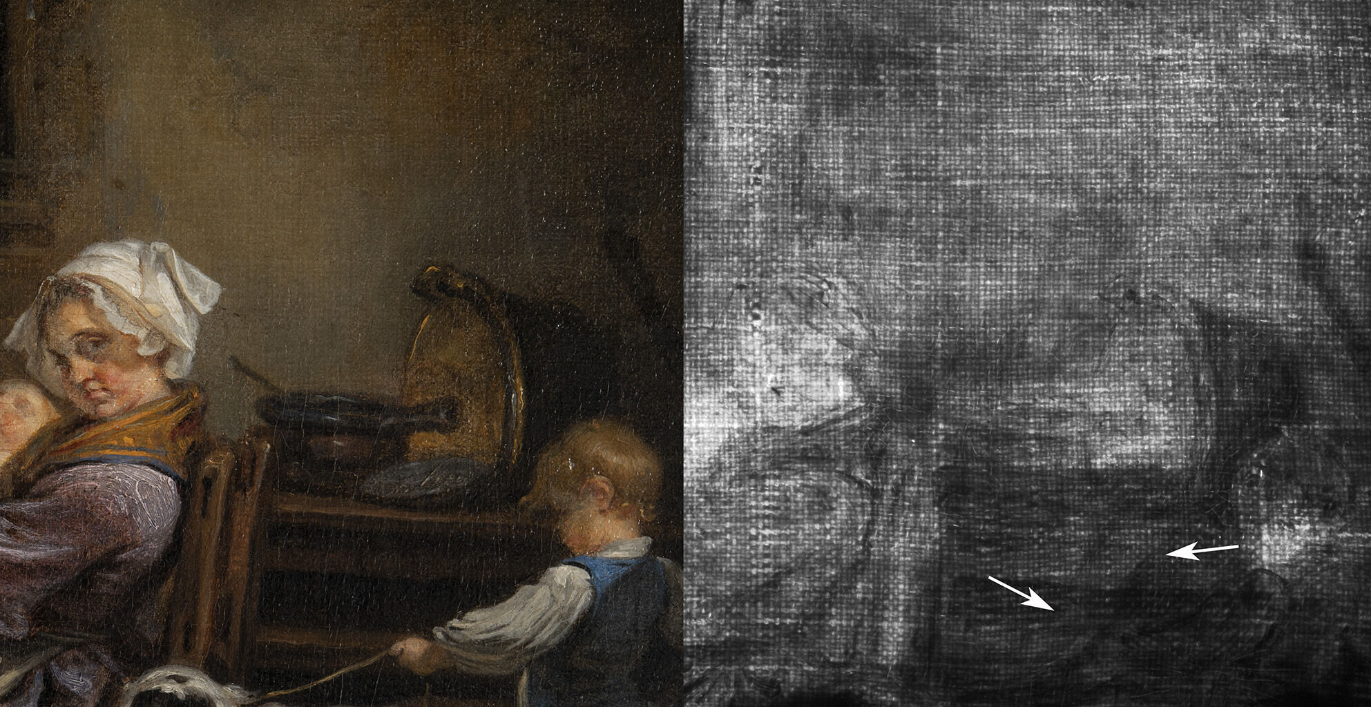 The Nursemaids was acquired by the Nelson-Atkins in 1931 as an autograph work by Jean-Baptiste Greuze, and its authenticity was first questioned in 1979; up until recently, many Greuze specialists referred to the painting as a copy of a lost original. In his accompanying catalogue essay, Richard Rand summarizes the provenance and recorded dimensions of the small-scale canvas and identifies select passages that align with Greuze in terms of quality and style, in spite of the compromised paint surface from past cleaning. Technical study of The Nursemaids with transmitted infrared (IR) photographytransmitted infrared (IR) photography: An examination technique whereby the light source is placed on one side of the artwork while an electronic infrared imager or IR-modified digital camera placed on the opposite side captures the IR that is transmitted. This form of IR photography can be used to detect characteristics of the artist’s paint application, underlying compositions, artist changes, or inscriptions now covered by a lining canvas. and raking illuminationraking light: An examination technique in which light is placed at a shallow angle from one direction to reveal the surface topography. has revealed several artist changes that are significant for any painting whose status has been questioned.