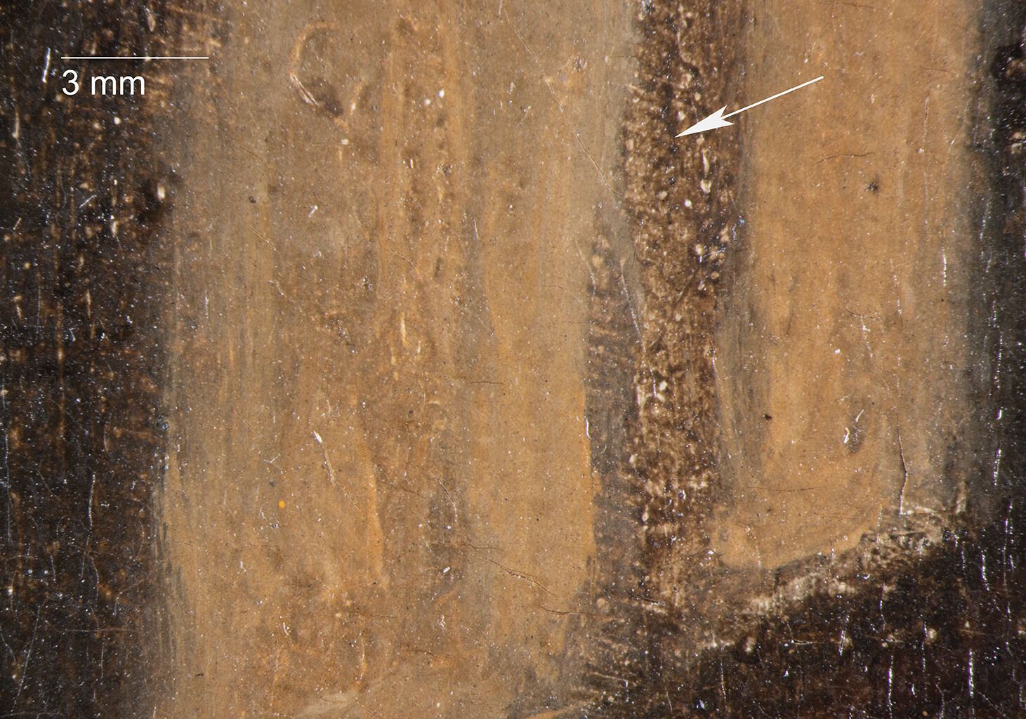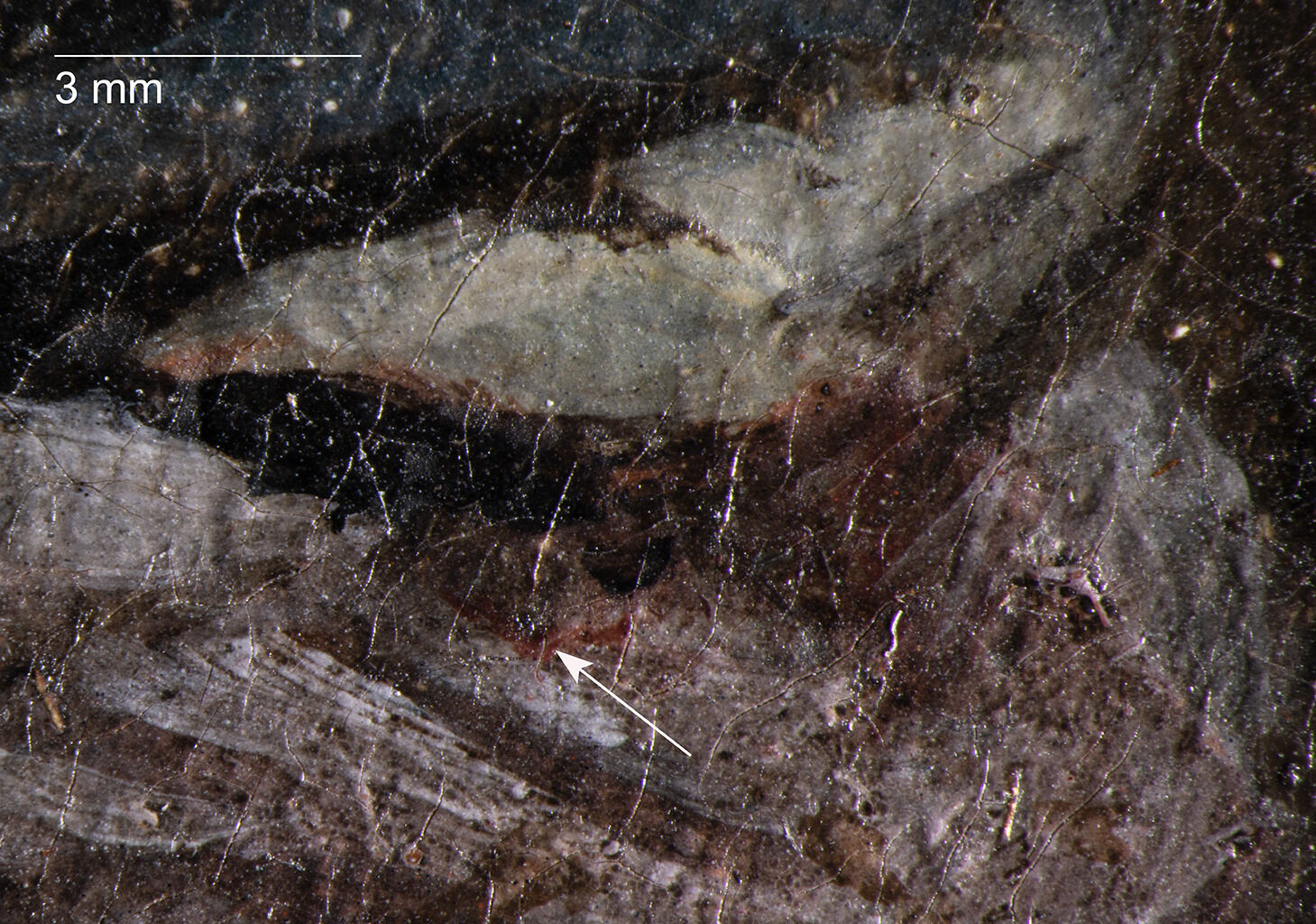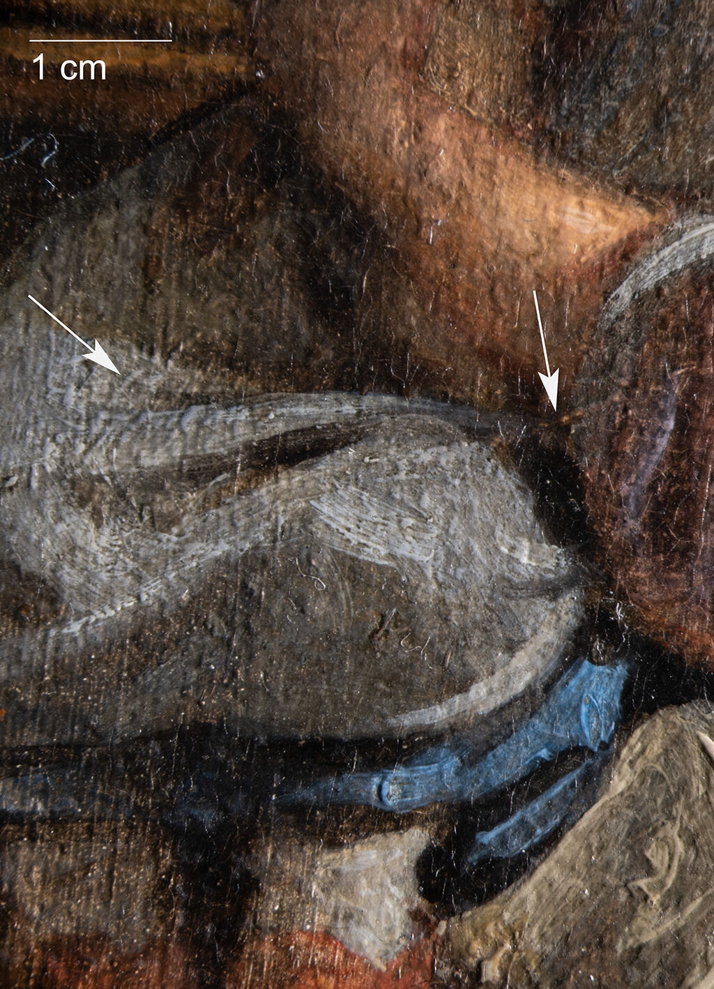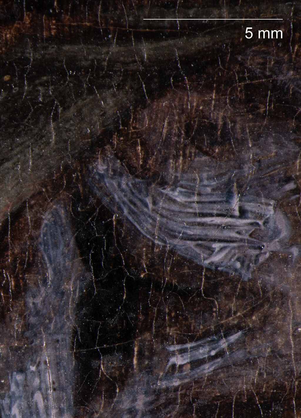 No clear underdrawing was identified when the painting was examined with the stereomicroscope. Although finely painted lines at the girl’s wrist in Figure 11 suggest a preliminary sketch, these reinforcing strokes lie on top of the gray sleeve. However, transmitted IR photography suggests the use of fine paint strokes to mark compositional elements.