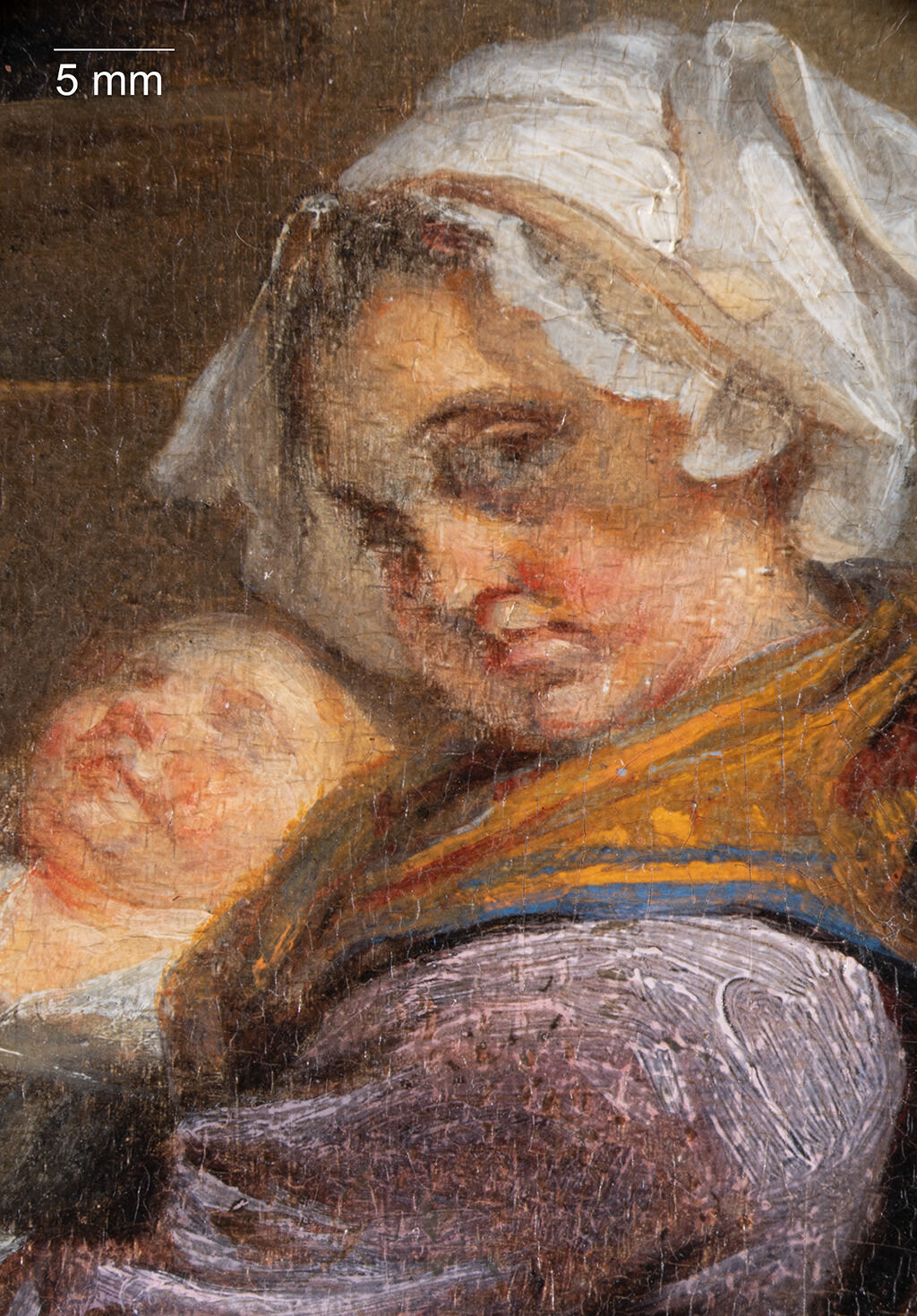 Fig. 16. Photomicrograph of the right woman, The Nursemaids (ca. 1765), underscoring the deleterious effects of overcleaning on Greuze’s thin paint layers and delicate scumbles