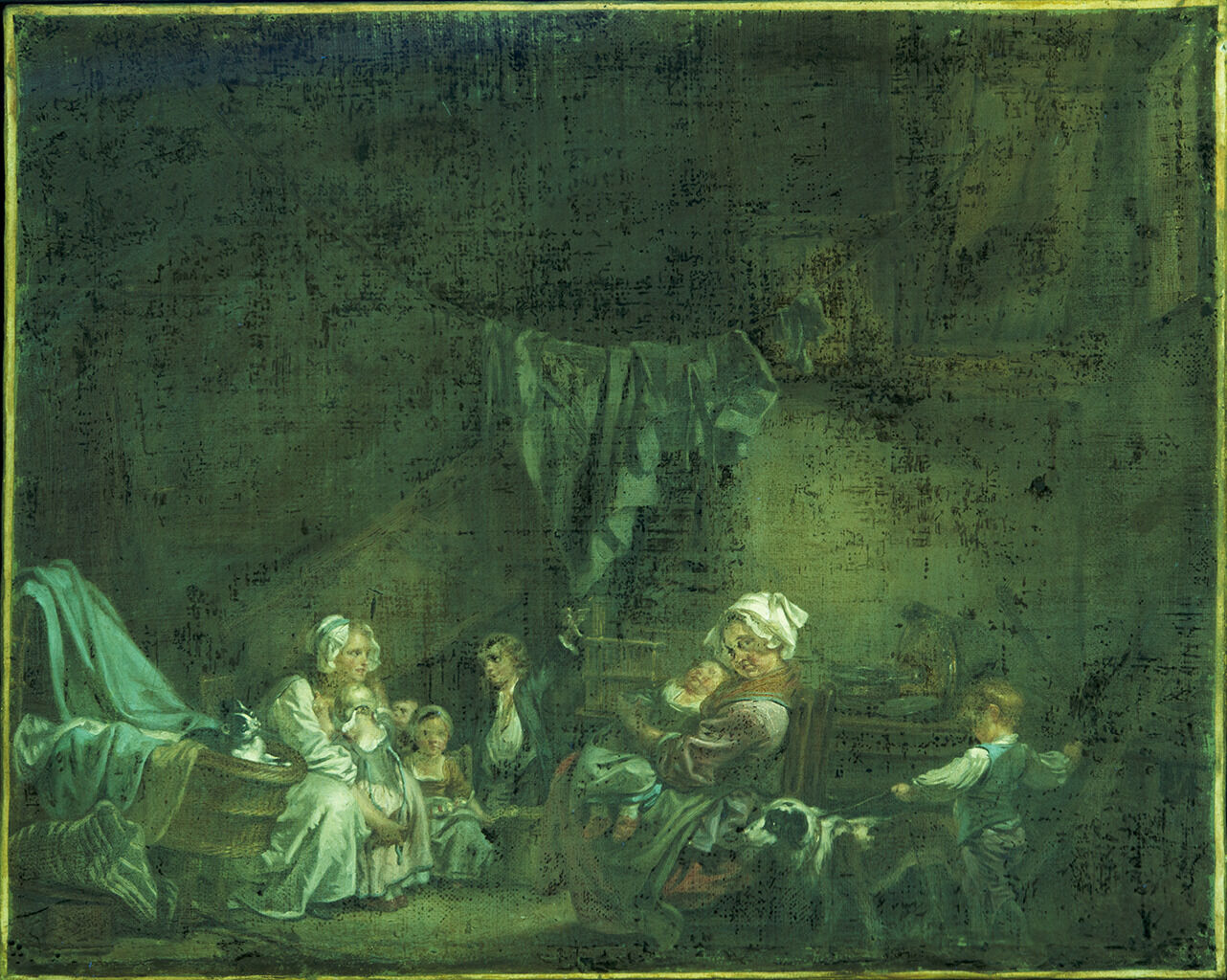 However compromised the current state of the picture may now be, it still exhibits the picturesque qualities that caught the attention of the Salon critics: “Here we recognize the ingenious naïveté of the author,” wrote the critic Charles Joseph Mathon de la Cour. “This painter sees nature as an artist should see it, that is to say, in love, with eyes that miss nothing and embellish everything.”21“On y reconnaît la naïveté ingénieuse de l’Auteur. Ce Peintre voit la nature comme un Artiste doit la voir, c’est-à-dire, en Amant, avec des yeux à qui rien n’échappe, & qui embellissent tout”; Troisième Lettre, à Monsieur **, Sur les Peintures, les Sculptures, et les Gravures, exposées au Sallon [sic] du Louvre en 1765, Bibliothèque nationale de France, Paris, Collection Deloynes, vol. 8, no. 110, p. 11, repr., in Charles Joseph Mathon de la Cour, Lettres à Monsieur ** sur les Peintures, les Sculptures et les Gravures, exposées au Sallon [sic] du Louvre en 1765 (Paris: Bauche and D’houry, 1765), 59. For Diderot, who was reminded of works by the Dutch genre painter Adriaen Ostade (1610–85), “the resulting effect rings true. . . . You believe yourself to be in the cottage, nothing suggests otherwise, in either its content or its handling.” Looking at the picture today, however, it is difficult to follow him when he exclaimed that “One can’t paint any more vigorously;” or to agree with him that “as for myself, it’s the picture itself that I’d ask for.”22“On ne peint pas avec plus de vigueur. L’effet en est vrai . . . Vous croyez être dans une chaumière. Rien ne détrompe, ni la chose, ni l’art. On demande que le berceau soit plus piqué de lumière; pour moi, c’est le tableaux que je demande”; Diderot, Salon de 1765, 195, English translation by Goodman, Diderot on Art, 110. But viewers today need to be mindful that the picture no longer presents itself as it must have in 1765.