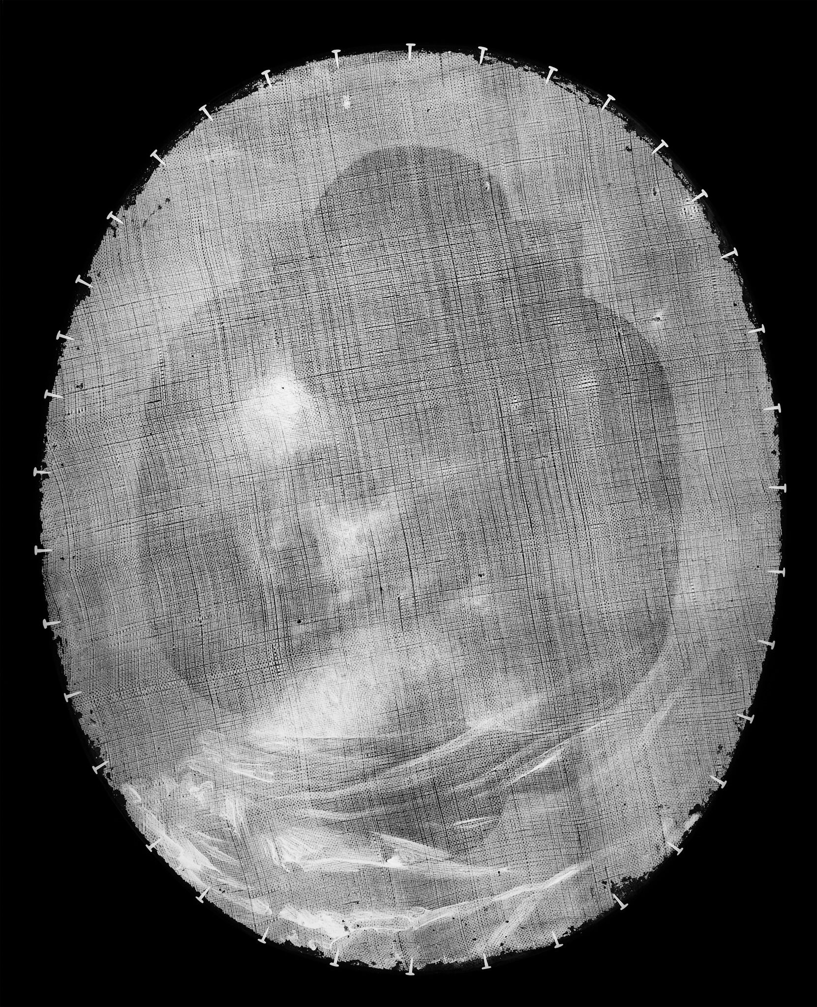 Although there are few opportunities to study the original canvas or the painting edges because the painting has been linedlining: A procedure used to reinforce a weakened canvas that involves adhering a second fabric support using adhesive, most often a glue-paste mixture, wax, or synthetic adhesive., radiographyX-ray radiography (also referred to as x-radiography or radiography): Radiography is an examination tool analogous to the use of X-rays in medicine whereby denser components of a painted composition can be recorded as an inverted shadow image cast on film or a digital X-ray imaging plate from a source such as an X-ray tube. The method has been used for more than a century and is most effective with dense pigments incorporating metallic elements such as lead or zinc. It can reveal artist changes, underlying compositions, and information concerning the artwork’s construction and condition. The resulting image is called an x-radiograph or radiograph. It differs from the uses of X-ray spectrometry in being dependent on the density of the paint to absorb X-rays before they reach the film or image plate and being non-specific as to which elements are responsible for the resulting shadow image. confirms the presence of a plain-weaveplain weave: A basic textile weave in which one weft thread alternates over and under the warp threads. Often this structure consists of one thread in each direction, but threads can be doubled (basket weave) or tripled to create more complex plain weave. Plain weave is sometimes called tabby weave. fabric with numerous weave irregularities (Fig. 5).2Film-based radiograph no. 564, NAMA conservation file, 31-55. Stretcher cracksstretcher cracks: Linear cracks or deformations in the painting’s surface that correspond to the inner edges of the underlying stretcher or strainer members. at the perimeter edges of the painting do not align with the location of the underlying support members, indicating that the current stretcherstretcher: A wooden structure to which the painting’s canvas is attached. Unlike strainers, stretchers can be expanded slightly at the joints to improve canvas tension and avoid sagging due to humidity changes or aging. is a modern replacement. However, the combination of the stretcher cracks and cuspingcusping: A scalloped pattern along the canvas edges that relates to how the canvas was stretched. Primary cusping reveals where tacks secured the canvas to the support while the ground layer was applied. Secondary cusping can form when a pre-primed canvas is re-stretched by the artist prior to painting. (right, left, and bottom edges) suggests that the dimensions of the painting have not been significantly altered.
