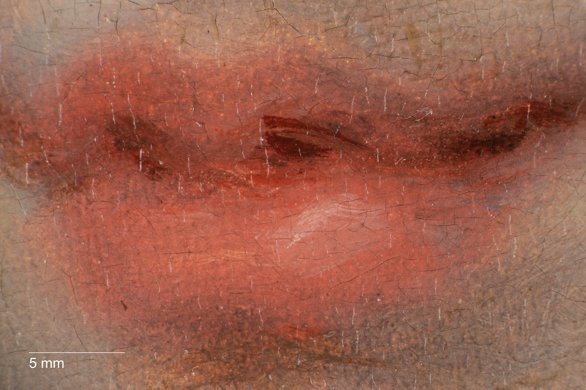 Fig. 7. Photomicrograph of Head of a Girl (ca. 1770 or later), showing painterly touches of bright red, pink, and magenta on the lip as well as bright blue strokes at the lower right corner