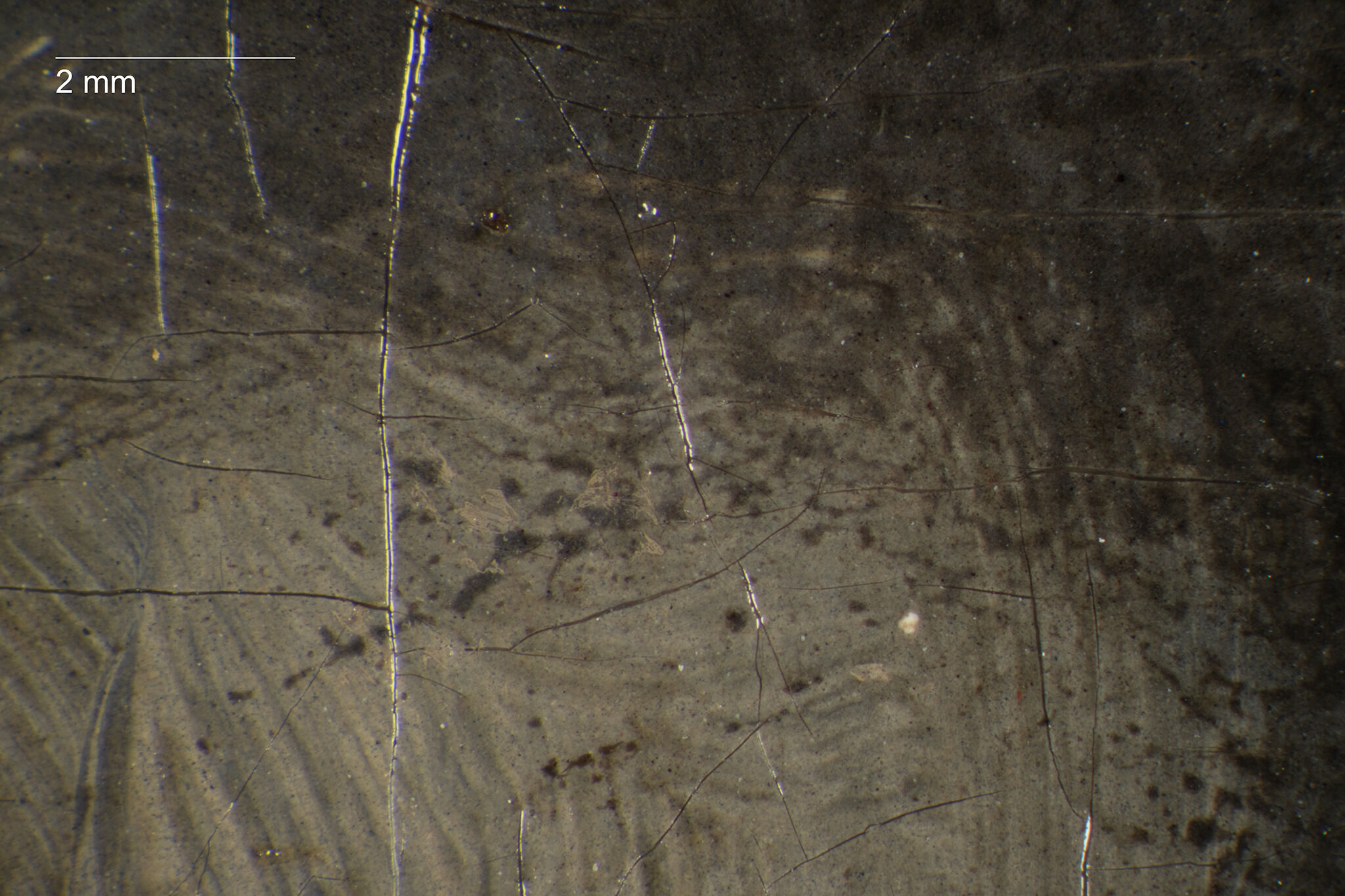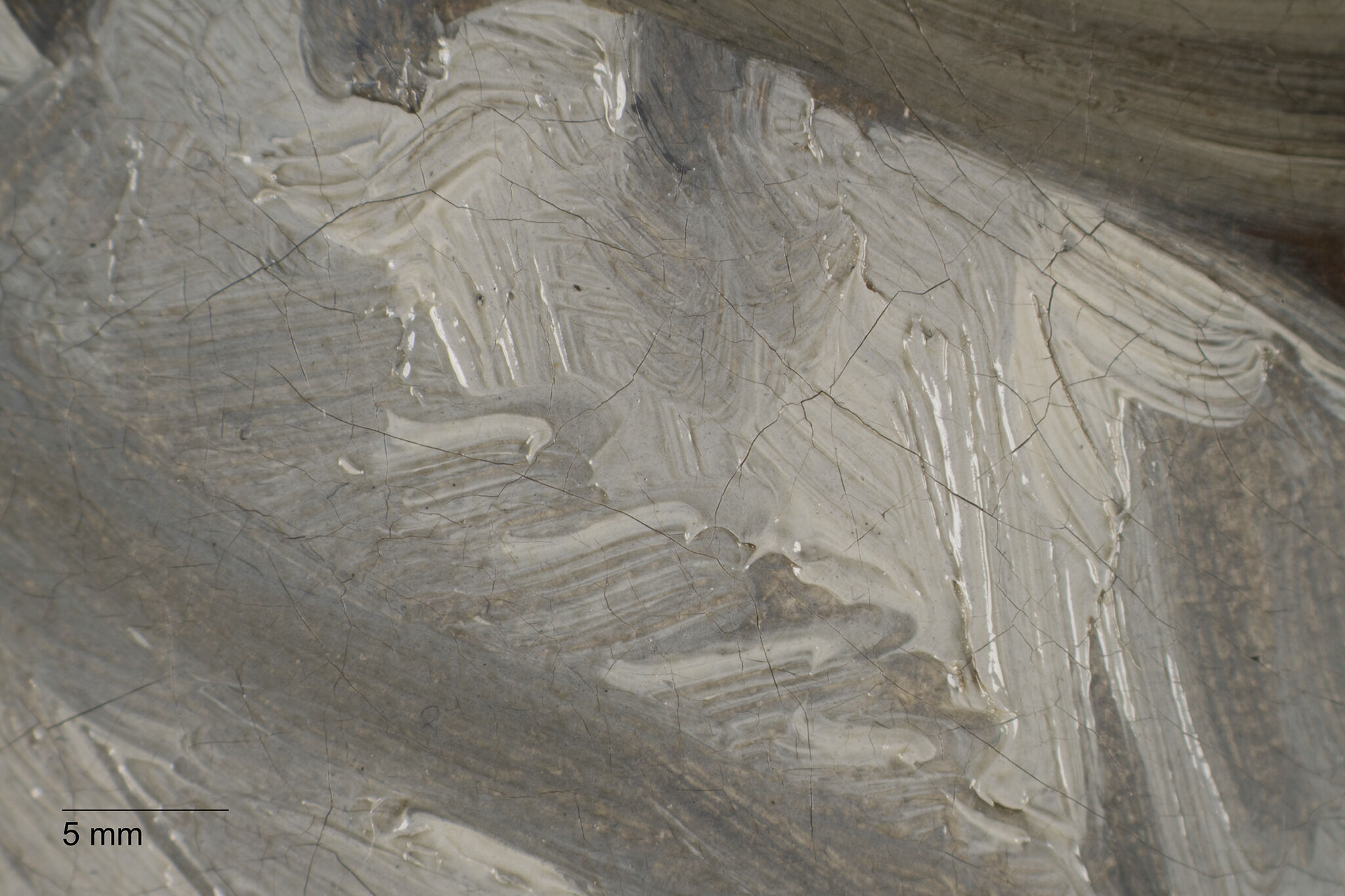 Fig. 10. Photomicrograph of the gray background paint overlapping the sitter’s garment at her proper right shoulder, Head of a Girl (ca. 1770 or later)