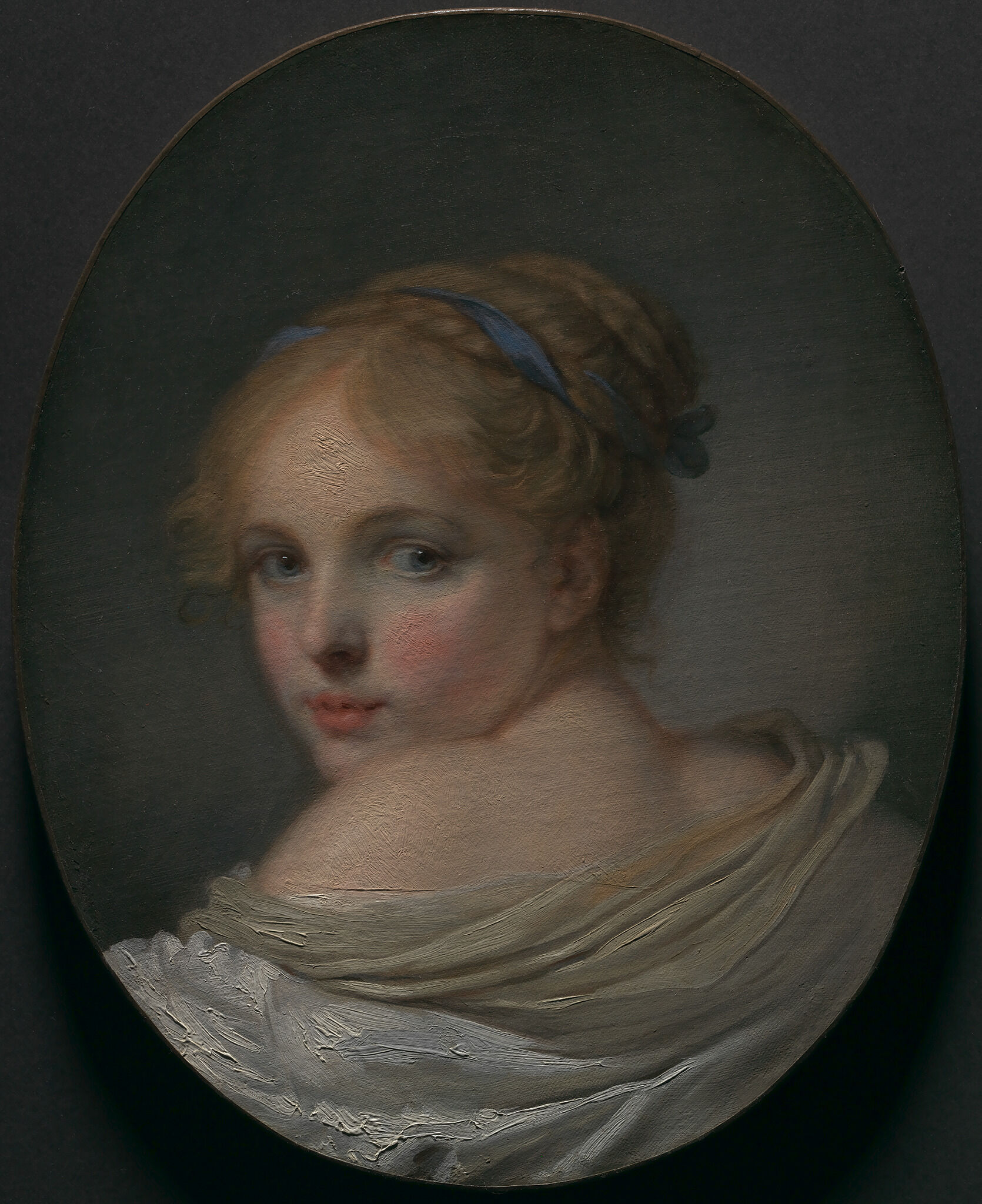 This painting depicts the bust of an adolescent girl looking over her left shoulder at the viewer. Her reddish-blonde hair, parted in the middle, braided and coiled at the top of her head, is held in place by a blue ribbon; loose strands fall next to her right eye. She wears a white chemisechemise: A plain, thin white cotton garment with short sleeves and sometimes a low neckline. and an off-white scarf that fall loosely to reveal her bare shoulder and neck. A strong light illuminates her from the left, throwing her form into strong relief against the dark background. The compositional forms—the curves of the drapery folds; the rounded contours of the model’s shoulder, neck, and cheeks; the coiled braid of her hair—echo the oval format of the canvas. The artist’s smooth and creamy brushwork enhances the intimacy of the conceit. Indeed, the effect is startlingly intimate, as if we have surprised the girl from behind, causing her to turn suddenly, although her expression is more one of pleasing recognition than of fear or consternation.
