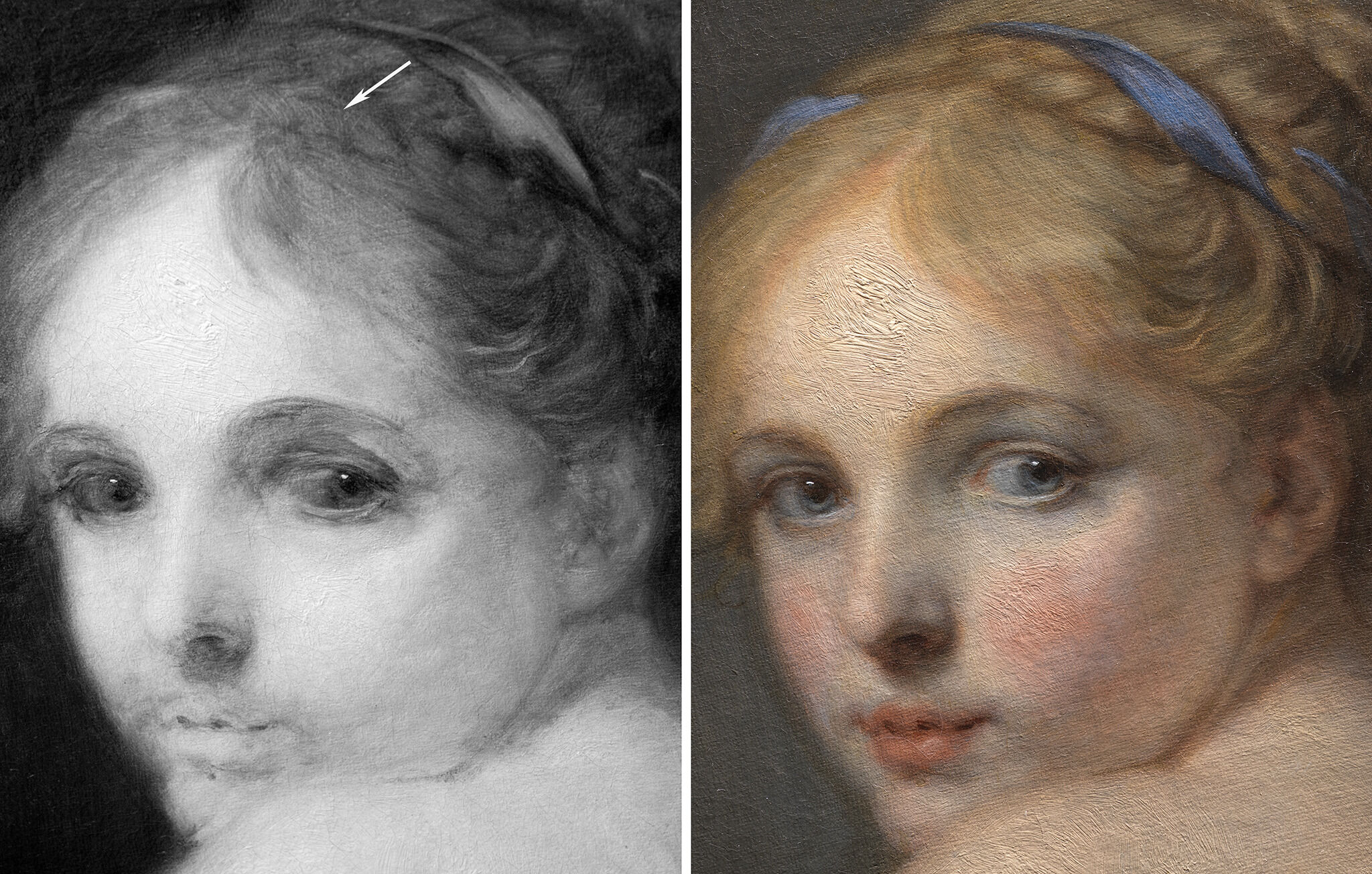 Fig. 11. The pentimento of the braid’s earlier position is evident in the reflected infrared digital photograph (left) and raking illumination detail (right), Head of a Girl (ca. 1770 or later).